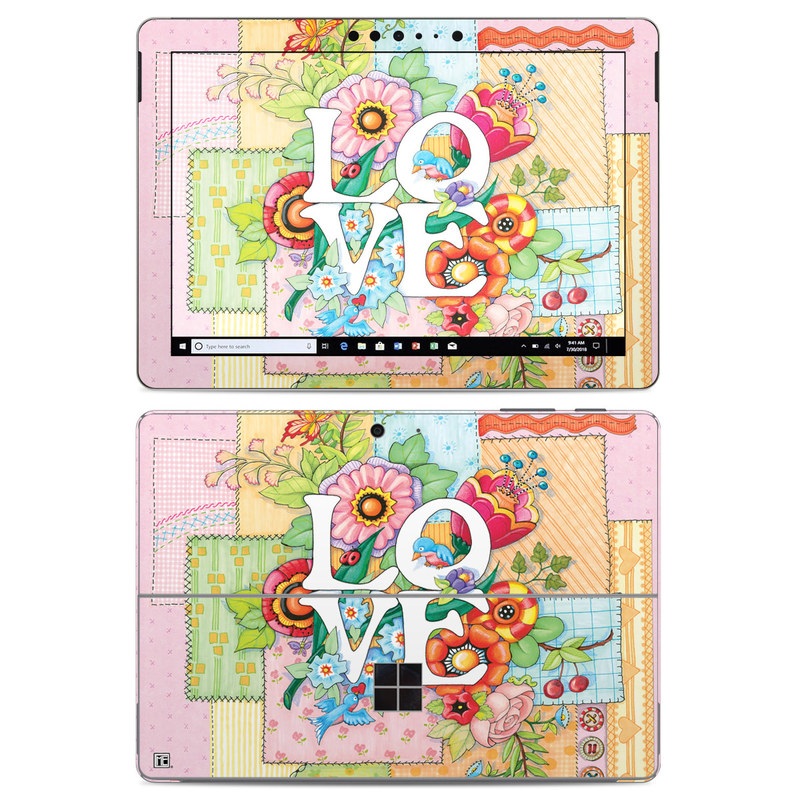 iStyles Microsoft Surface Go Skin design of Illustration, Graphics, Art, with pink, blue, white, orange, yellow, green, red colors, and tagged with signs, flowers, animals, flower, flowers, love, patch, patches, pattern, sew, sewing, stitch, stitches, stitching.