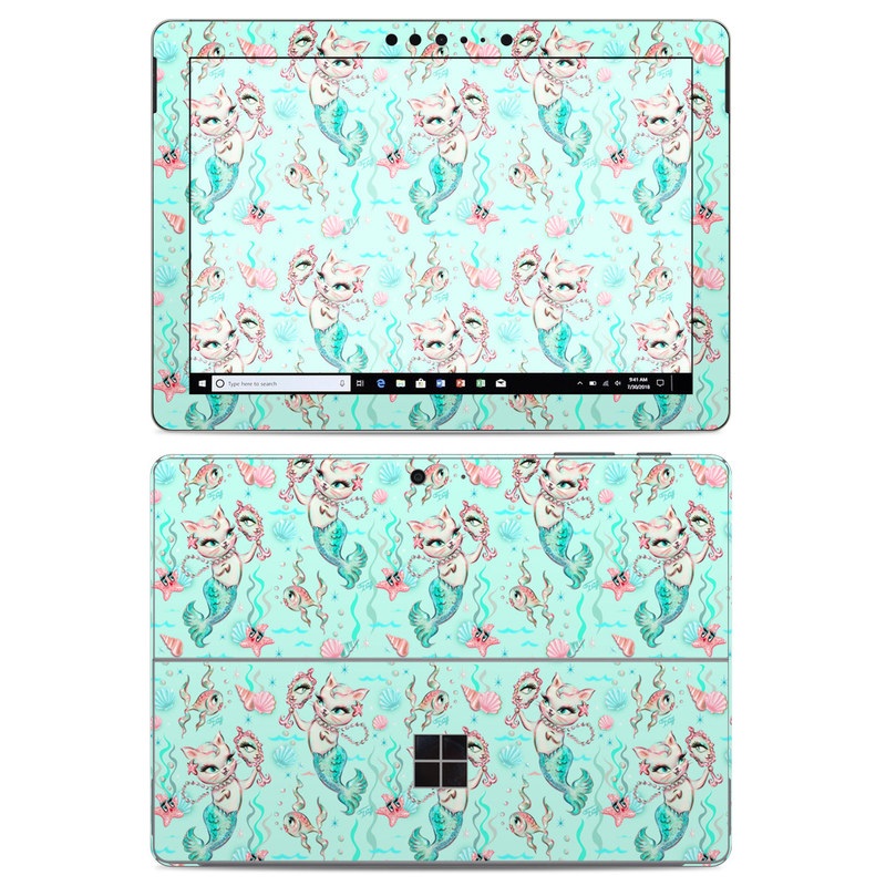 iStyles Microsoft Surface Go Skin design of Green, Aqua, Pattern, Teal, Turquoise, Pink, Textile, Wrapping paper, Design, with blue, pink, white, green colors, and tagged with patterns, animals, fantasy, objects, animals, cat, kitten, kittens, mermaid, mermaids, ocean, pastel, pattern, sea, sealife.