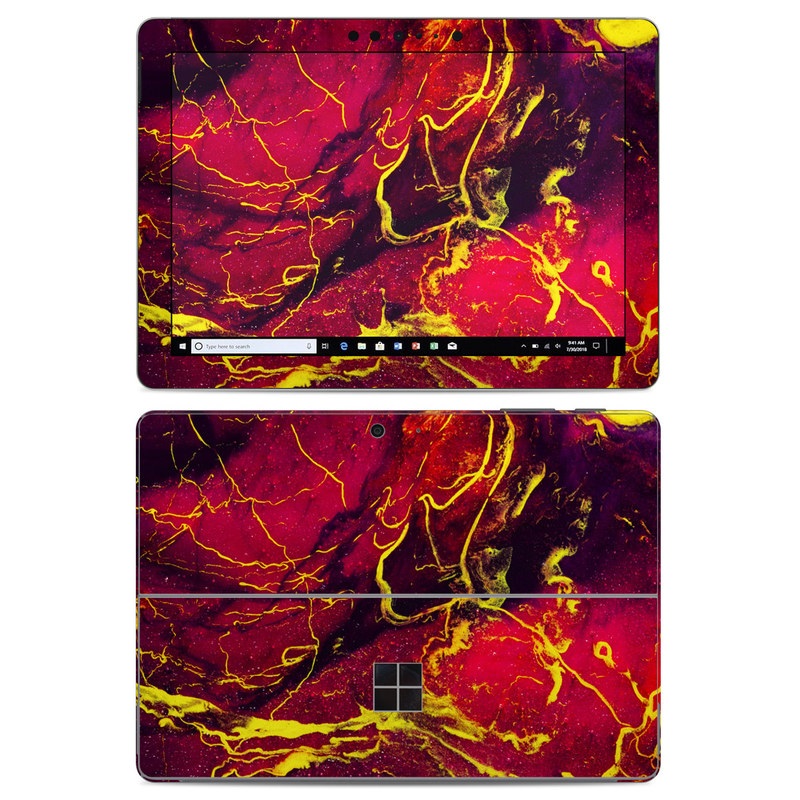 iStyles Microsoft Surface Go Skin design of Red, Purple, Geological phenomenon, Pattern, Fractal art, Art, Fictional character, Graphics, with red, yellow, black colors, and tagged with abstract, space, galactic, marble, paint, painting, purple, red, space, splatter, yellow.