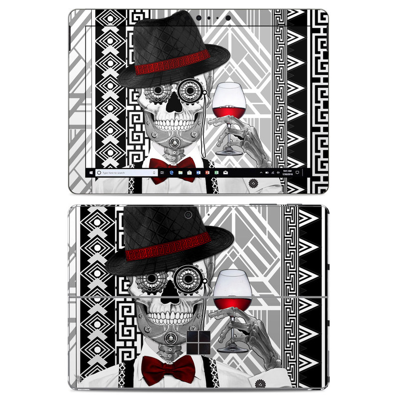 iStyles Microsoft Surface Go Skin design of Cartoon, Poster, Font, Illustration, Headgear, Games, Photo caption, Fictional character, Graphic design, Hat, with black, white, red colors, and tagged with skulls, objects, patterns, 1920's, artdeco, blackandwhite, calavera, dayofthedead, diadelosmuertos, flapper, greatgatsby, newmexico, pattern, skeleton, skull, sugarskull, vanderbone, wine.