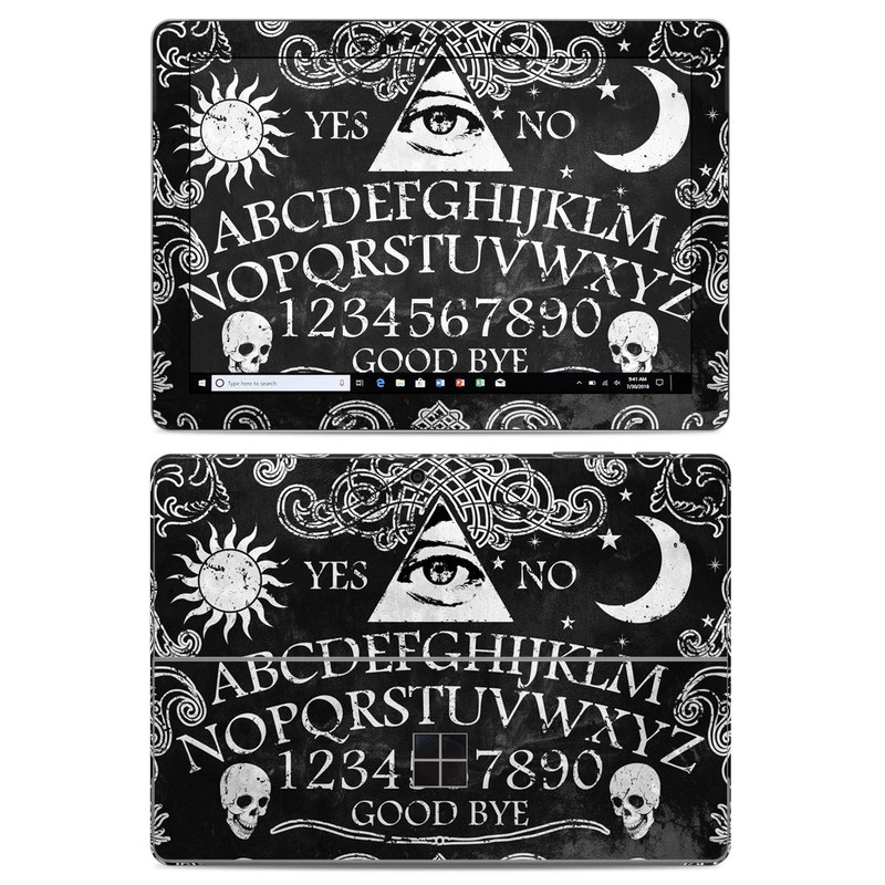 iStyles Microsoft Surface Go Skin design of Text, Font, Pattern, Design, Illustration, Headpiece, Tiara, Black-and-white, Calligraphy, Hair accessory, with black, white, gray colors, and tagged with signs, skulls, black, demons, ghosts, magic, magick, paranormal, skull, spirit, talking.
