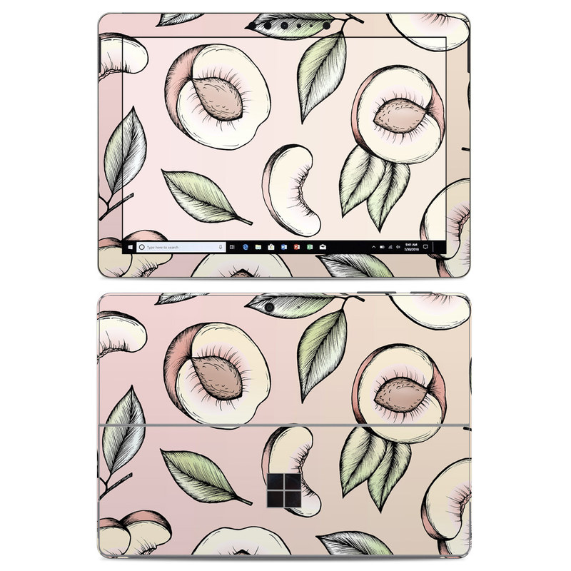 iStyles Microsoft Surface Go Skin design of Pattern, Leaf, Botany, Organism, Design, Plant, Illustration, Clip art, with pink, green, yellow, orange colors, and tagged with objects, patterns, fruit, leaf, leaves, nature, outdoors, pastel, peach, peaches, sketch.
