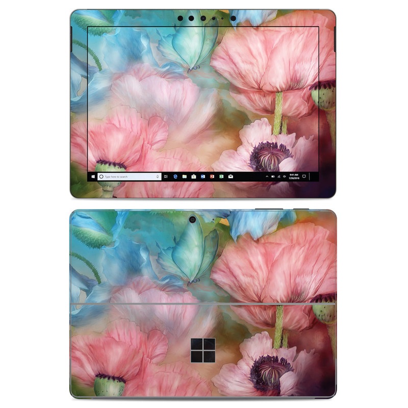 iStyles Microsoft Surface Go Skin design of Flower, Petal, Watercolor paint, Painting, Plant, Flowering plant, Pink, Botany, Wildflower, Still life, with gray, blue, black, red, green colors, and tagged with flowers, animals.