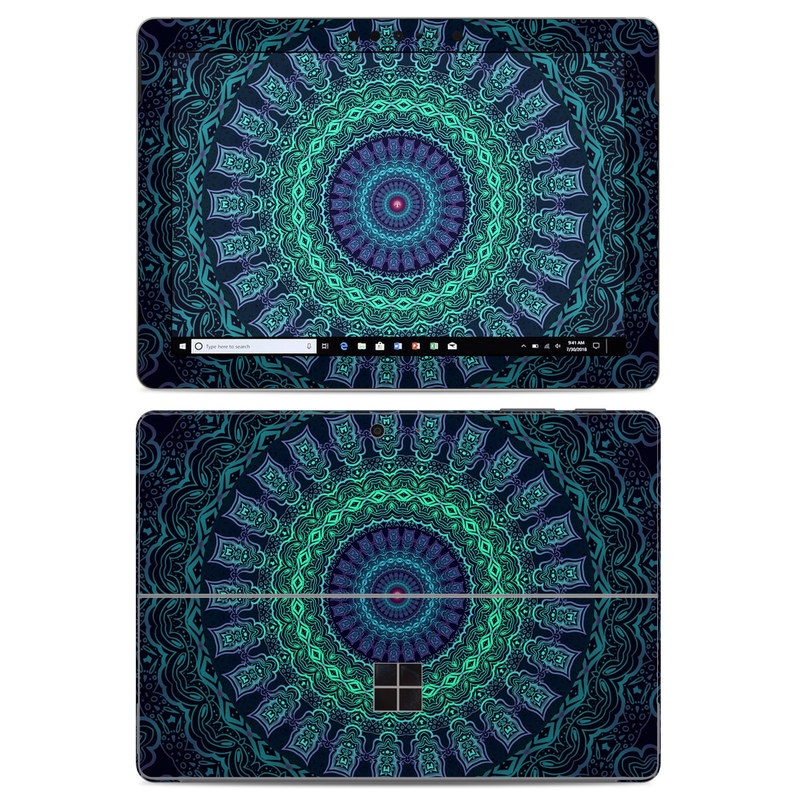 iStyles Microsoft Surface Go Skin design of Colorfulness, Blue, Green, Pattern, Teal, Turquoise, Art, Electric Blue, Aqua, Circle, Majorelle Blue, Visual Arts, Fractal Art, Design, Symmetry, Psychedelic Art, Graphics, Kaleidoscope, Motif, with black, green, red colors, and tagged with patterns, fractals, balance, blue, circle, green, mandala, neon, purple, rainbow, symmetry.