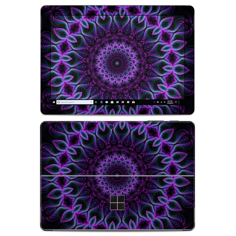 iStyles Microsoft Surface Go Skin design of Colorfulness, Pattern, Purple, Violet, Magenta, Red, Pink, Art, Fractal Art, Visual Arts, Design, Circle, Symmetry, Psychedelic Art, Motif, Kaleidoscope, Graphics, with black, purple, blue, white colors, and tagged with patterns, fractals, balance, flowers, green, leaves, mandala, nature, neon, pink, purple, rainbow, symmetry.