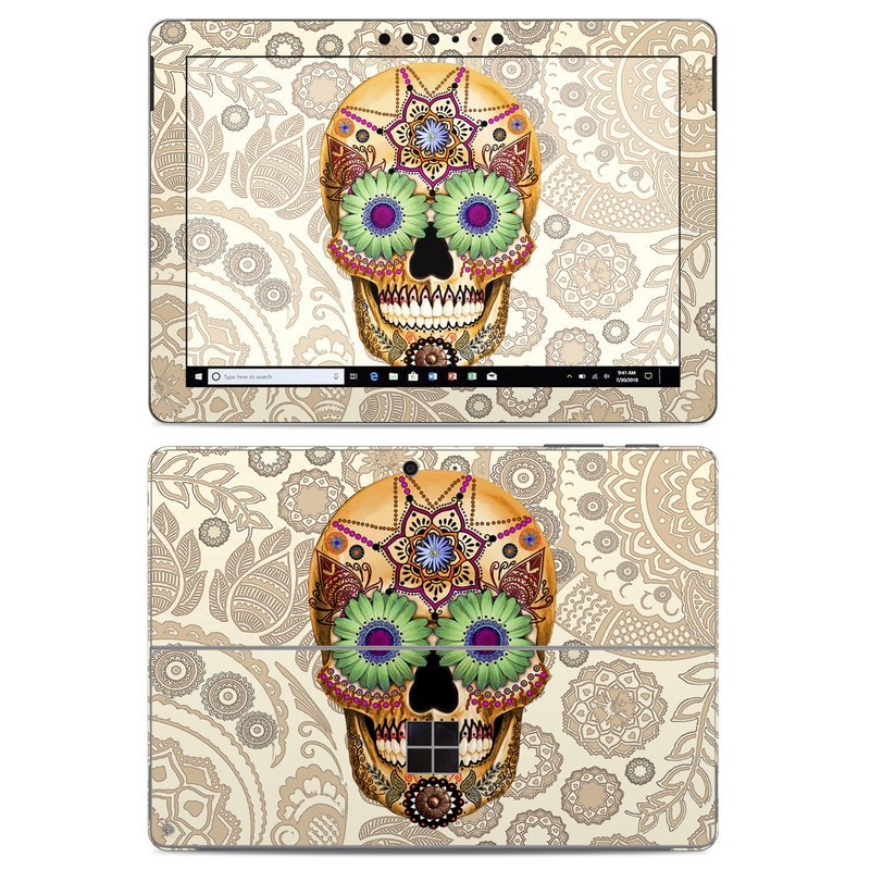 iStyles Microsoft Surface Go Skin design of Skull, Bone, Pattern, Design, Illustration, Visual arts, Fashion accessory, Art, with gray, yellow, green, black, red, pink colors, and tagged with patterns, skulls, flowers, nature.