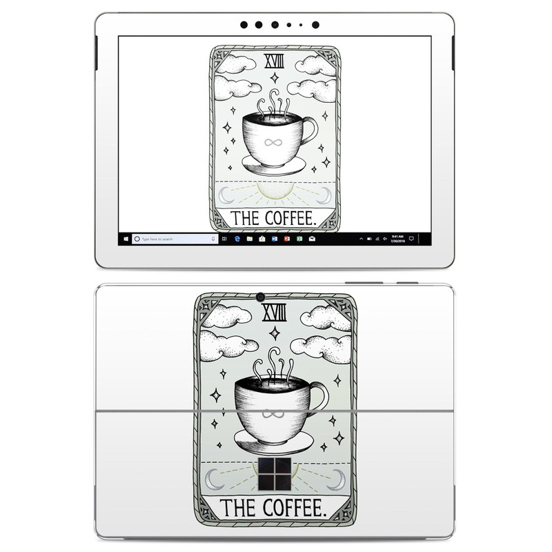 iStyles Microsoft Surface Go Skin design of Cup, Cartoon, Drinkware, Coffee cup, Tableware, Teacup, Illustration, Drink, Line art, with white, black, green, gray, yellow colors, and tagged with objects, signs, space, coffee, handdrawn, pastel, sketch, tarot.