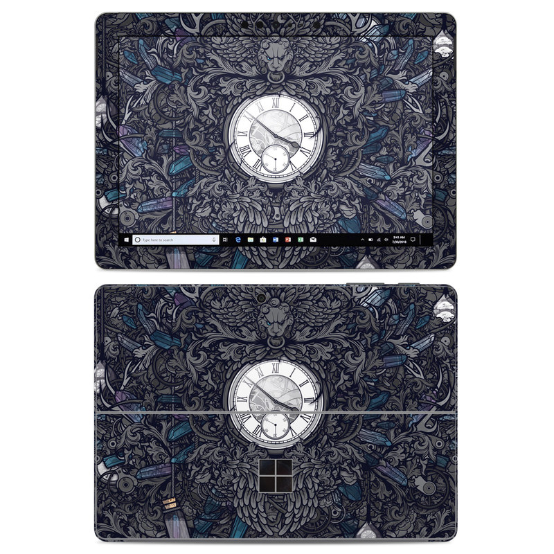 iStyles Microsoft Surface Go Skin design of Blue, Pattern, Psychedelic art, Design, Circle, Art, Font, Graphic design, Visual arts, Illustration, with black, gray colors, and tagged with objects, patterns, animals, grandfather, clock, clocks, alarm, time, antique, table.