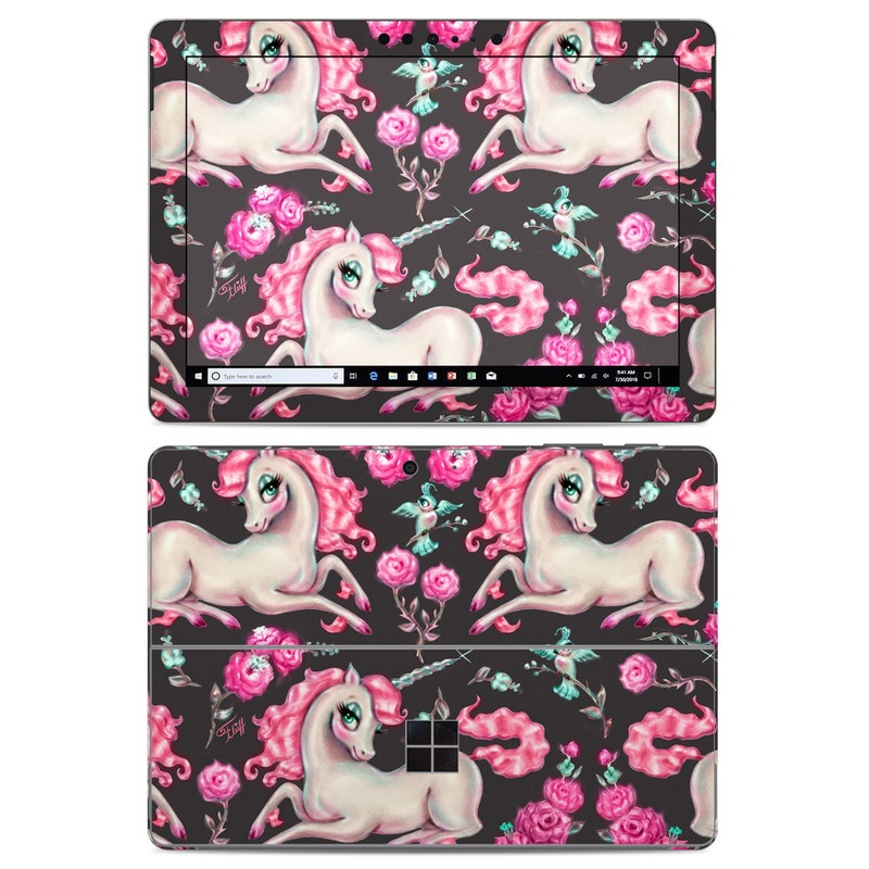 iStyles Microsoft Surface Go Skin design of Pink, Horse, Pony, Fictional character, Unicorn, Mythical creature, Mane, Textile, Animal figure, Illustration, with white, pink, blue, black, red colors, and tagged with patterns, animals, flowers, fantasy, flower, flowers, magic, magical, pink, rose, roses, unicorn, unicorns.