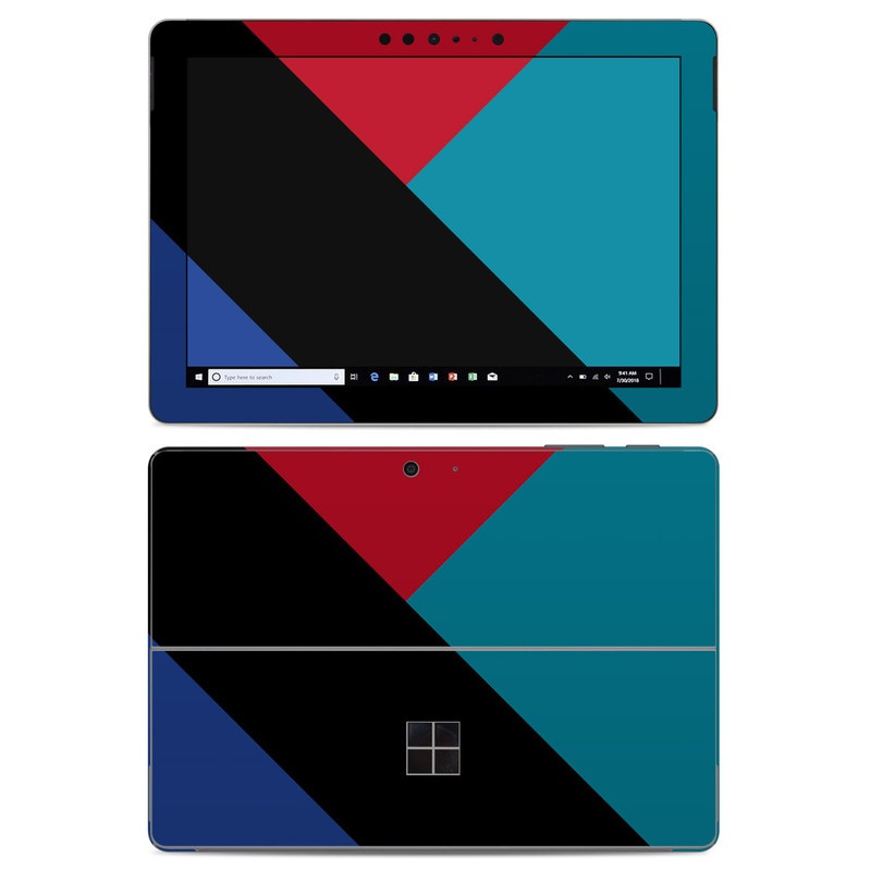 iStyles Microsoft Surface Go Skin design of Blue, Green, Turquoise, Azure, Teal, Electric blue, Line, Pattern, Design, Graphic design, with black, blue, red colors, and tagged with patterns, block, blocking, color, colorblock, geometric, shape, simple.