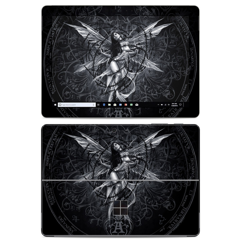 iStyles Microsoft Surface Go Skin design of Illustration, Graphic design, Darkness, Fictional character, Black-and-white, Pattern, Graphics, Mythical creature, Circle, Wing, with black, white colors, and tagged with flowers, signs, fantasy, people, hearts, angel, barbwire, gothic, steampunk, tattoo, tattooart.