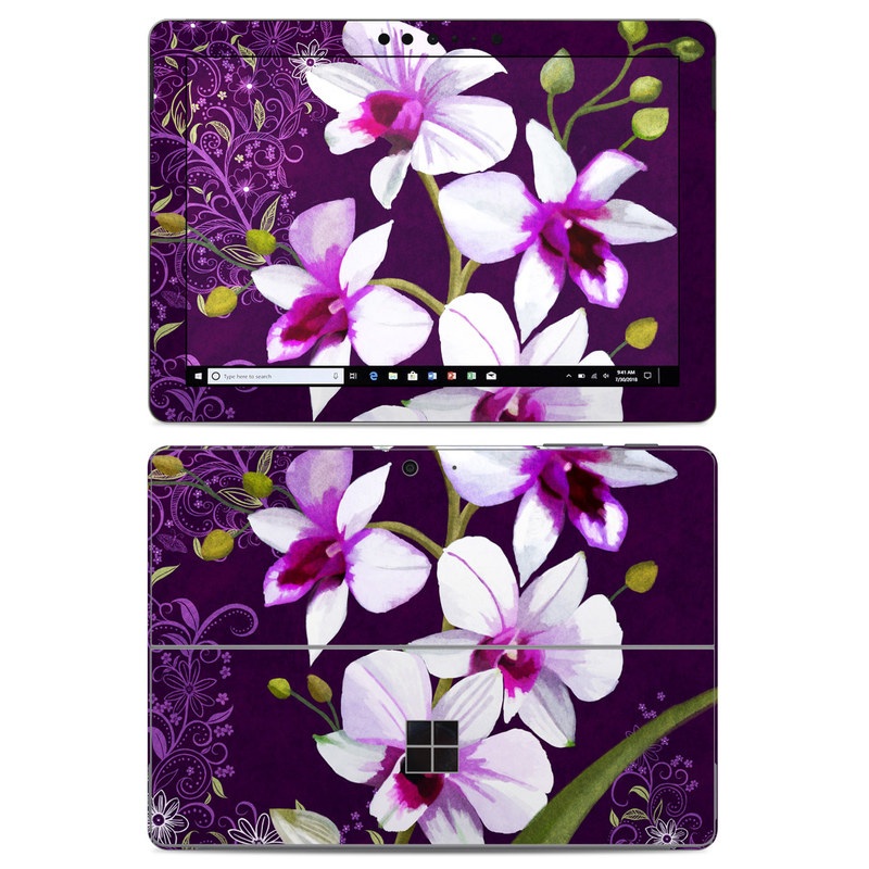 iStyles Microsoft Surface Go Skin design of Flower, Purple, Petal, Violet, Lilac, Plant, Flowering plant, cooktown orchid, Botany, Wildflower, with black, gray, white, purple, pink colors, and tagged with flowers, abstract.