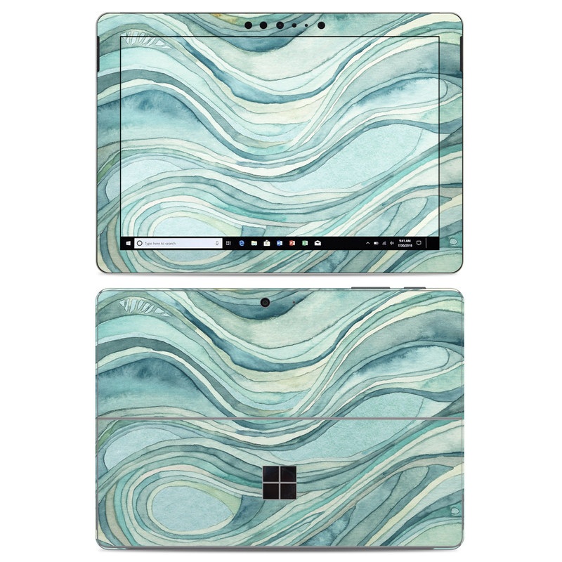 iStyles Microsoft Surface Go Skin design of Aqua, Blue, Pattern, Turquoise, Teal, Water, Design, Line, Wave, Textile, with gray, blue colors, and tagged with patterns.