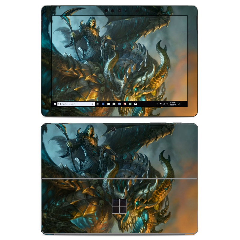 iStyles Microsoft Surface Go Skin design of Dragon, Cg artwork, Fictional character, Mythical creature, Demon, Mythology, Illustration, Cryptid, Art, with orange, yellow, black, brown, blue, white colors, and tagged with fantasy, animals, skulls, people, objects, bones, death, dragon, fire, grimreaper, skeleton.