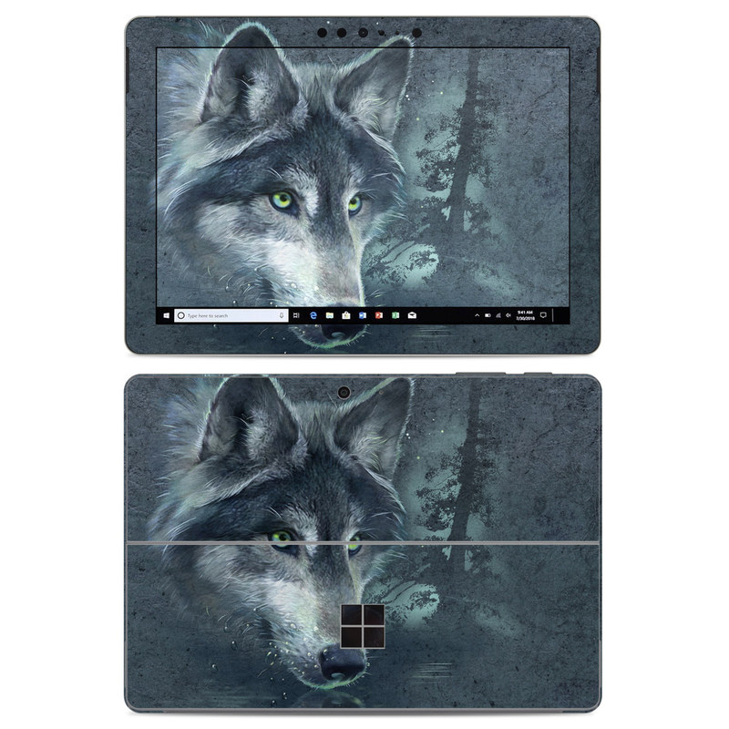 iStyles Microsoft Surface Go Skin design of Wolf, Canidae, Wildlife, Red wolf, Canis, canis lupus tundrarum, Snout, Saarloos wolfdog, Wolfdog, Carnivore, with black, gray, blue colors, and tagged with animals.