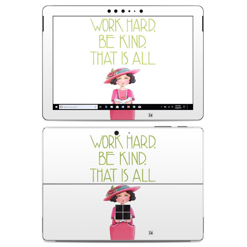 iStyles Microsoft Surface Go Skin design of Pink, Headgear, Font, Hat, with white, green, pink, black, white, yellow, blue colors, and tagged with signs, flowers, people, objects, cartoon, classy, draw, drawing, girl, green, lady, pink, woman, kind.