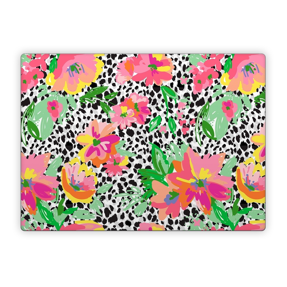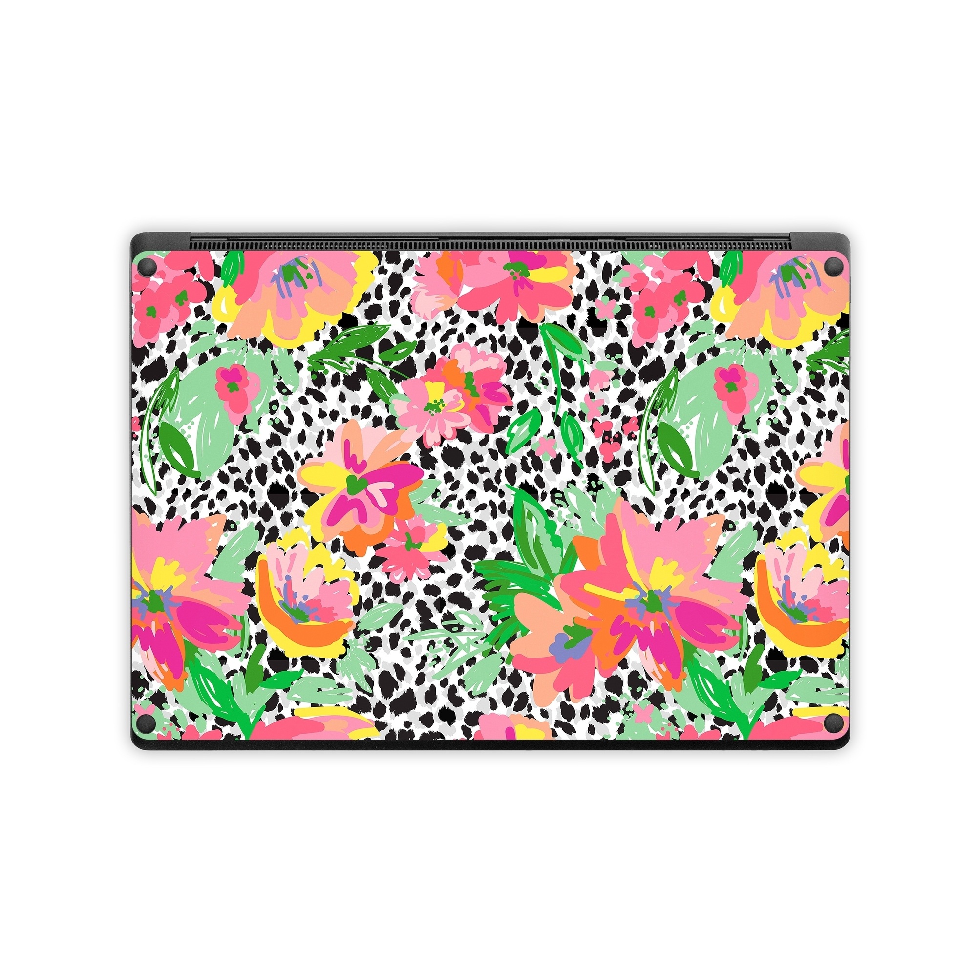 iStyles Microsoft Surface Laptop Series Skin design of Flower, Petal, Textile, Pink, Creative arts, Art, Magenta, Pattern, Plant, Symmetry, with pink, orange, yellow, purple, green, black, white colors, and tagged with patterns, flowers, flowers, leaves, arrangement.