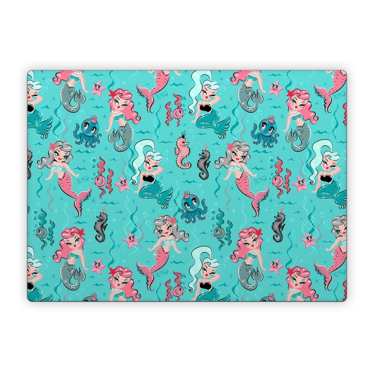 iStyles Microsoft Surface Laptop Series Skin design of Turquoise, Wrapping paper, Cartoon, Pattern, Textile, Aqua, Design, Gift wrapping, Illustration, Fictional character, with blue, pink, yellow, gray colors, and tagged with patterns, animals, people, fantasy, mermaid, mermaids, mystical, ocean, pastel, pattern, pinup, pinupgirl, sea, sealife.