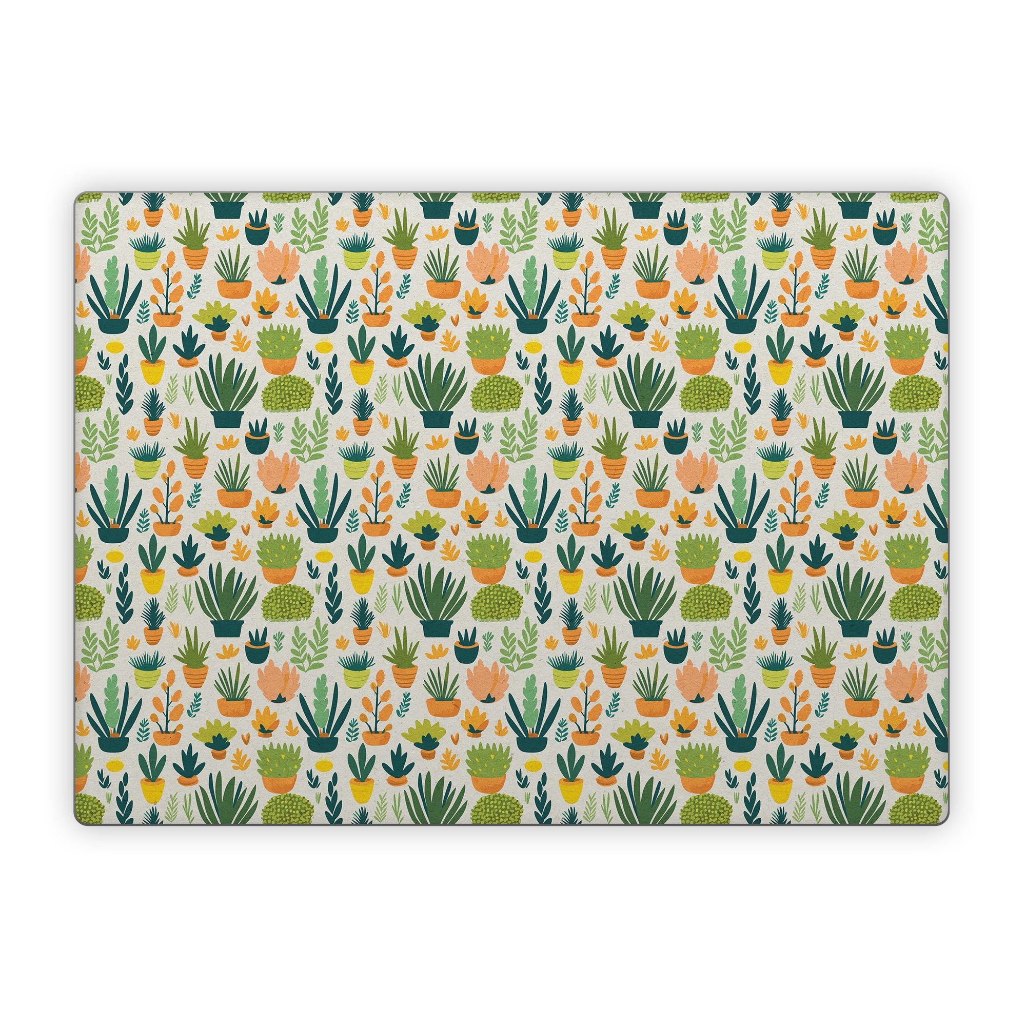 iStyles Microsoft Surface Laptop Series Skin design of Flower, Plant, Petal, Textile, Botany, Art, Creative arts, Flowering plant, Porcelain, Groundcover, with white, green, brown, yellow, orange colors, and tagged with patterns, objects, nature, plants, pots, gardening, pattern.