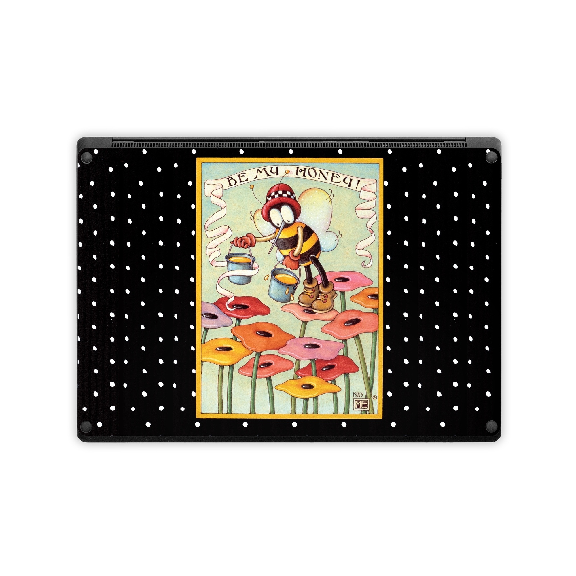 iStyles Microsoft Surface Laptop Series Skin design of Cartoon, Illustration, Art, with black, white, yellow, orange, pink, red, blue, green colors, and tagged with signs, flowers, people, objects, animals, bee, bumblebee, flowers, honey.
