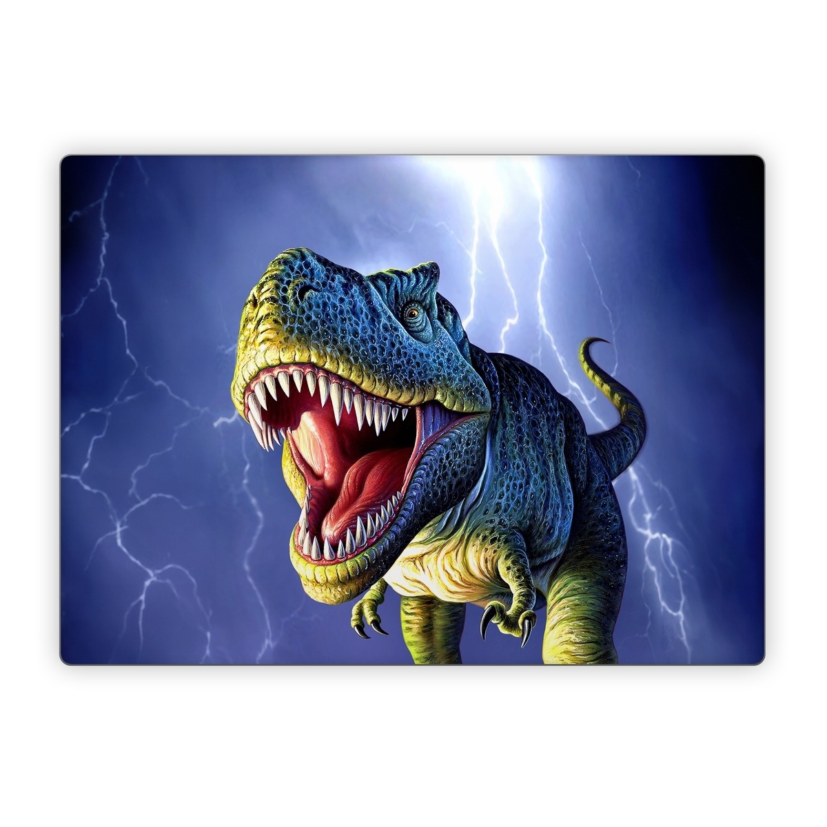 iStyles Microsoft Surface Laptop Series Skin design of Dinosaur, Extinction, Tyrannosaurus, Velociraptor, Tooth, Jaw, Organism, Mouth, Fictional character, Art, with blue, green, yellow, orange, red colors, and tagged with fantasy, animals.