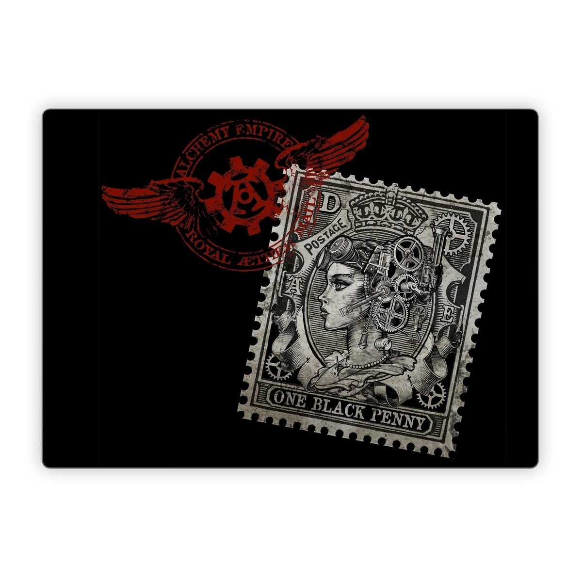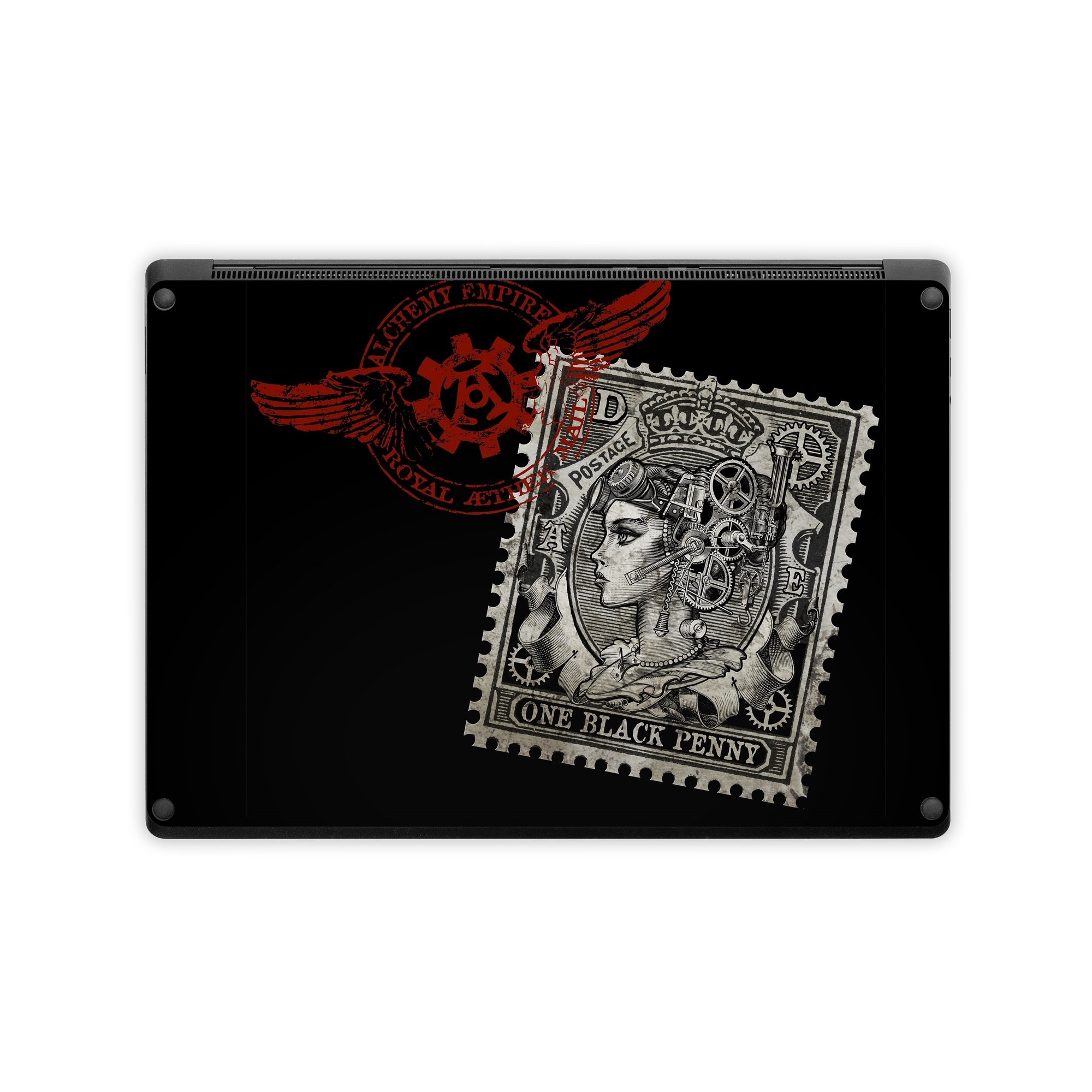 iStyles Microsoft Surface Laptop Series Skin design of Font, Postage stamp, Illustration, Drawing, Art, with black, gray, red colors, and tagged with people, objects, signs.