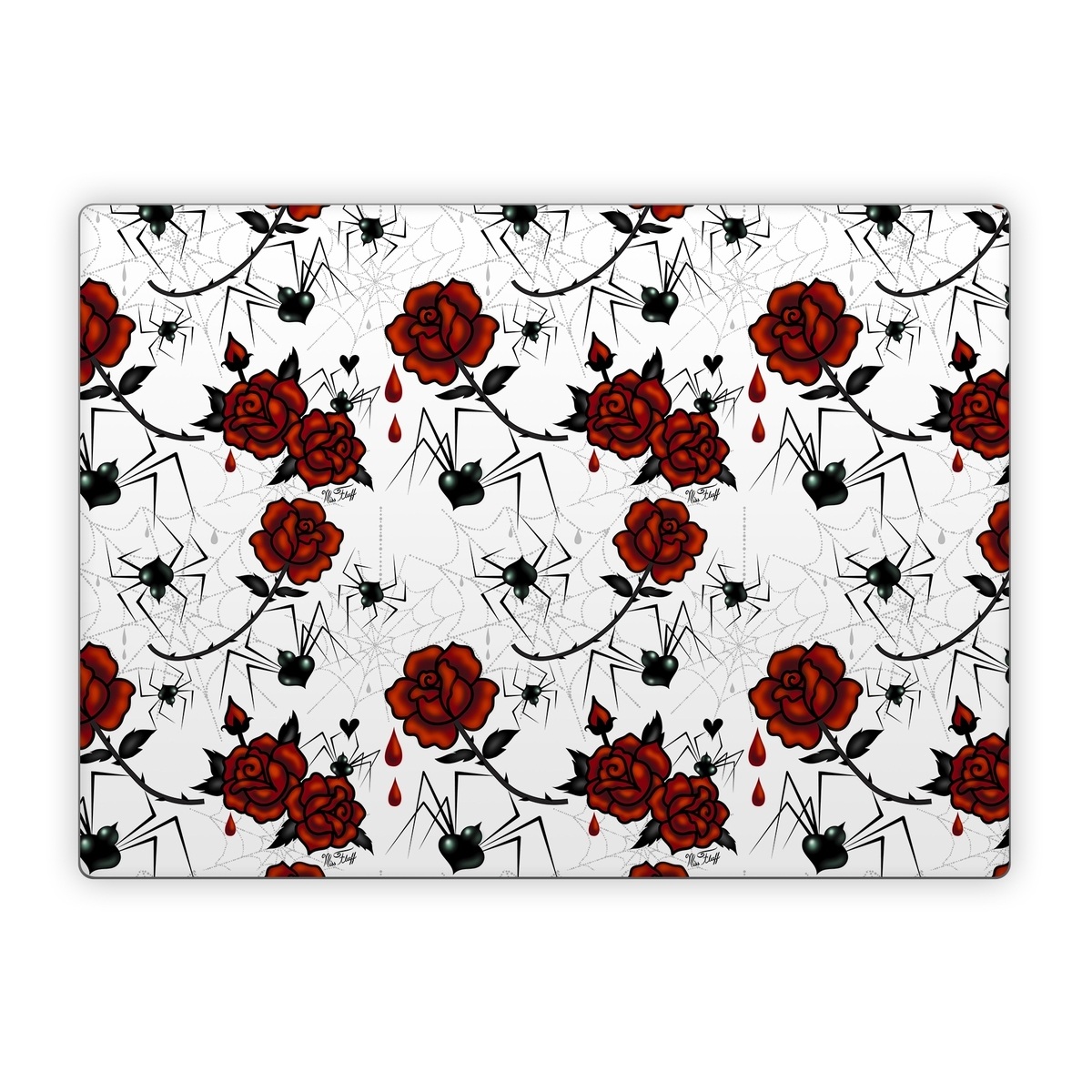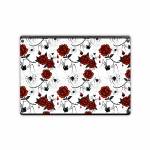 iStyles Microsoft Surface Laptop Series Skin design of Red, Pattern, Flower, Plant, Design, Floral design, Petal, Coquelicot, Wildflower, Rose, with black, white, red colors, and tagged with animals, flowers, blackwidows, #halloween, roses, spiderwebs, spiders, spooky, tattoo.