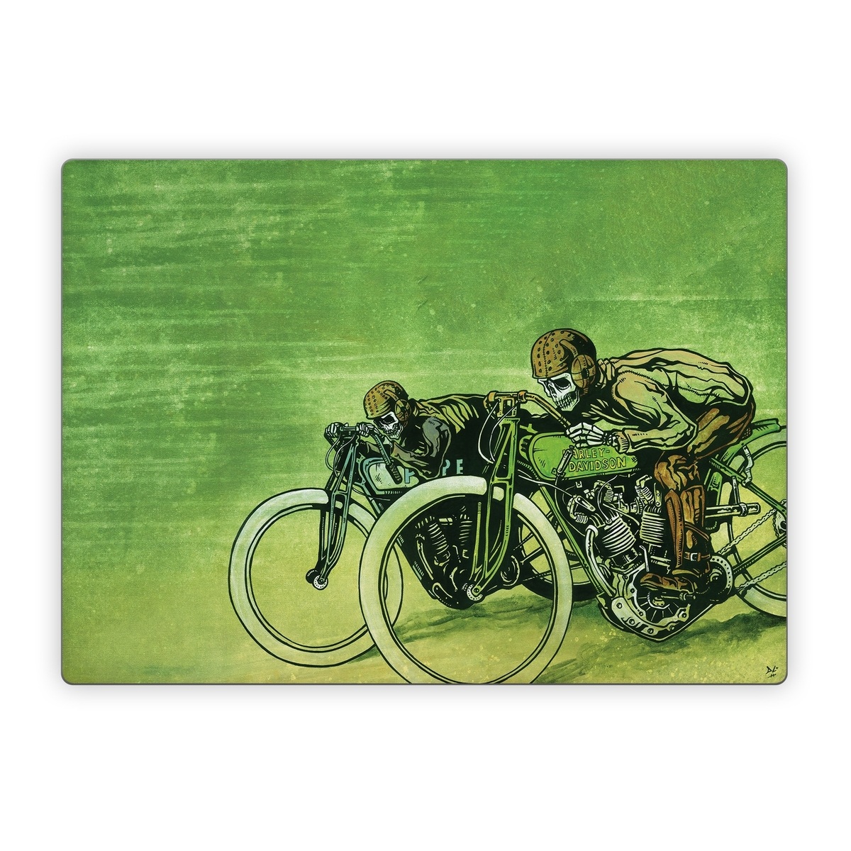 iStyles Microsoft Surface Laptop Series Skin design of Tire, Wheel, Bicycle, Bicycle tire, Automotive tire, Crankset, Bicycle handlebar, Motor vehicle, Bicycle wheel, Bicycle part, with green, gray, white, black, brown colors, and tagged with skulls, objects, motobike, motocycle, motorsport, 1910s, 1920s, circular, oval, race, course, wooden, planks.