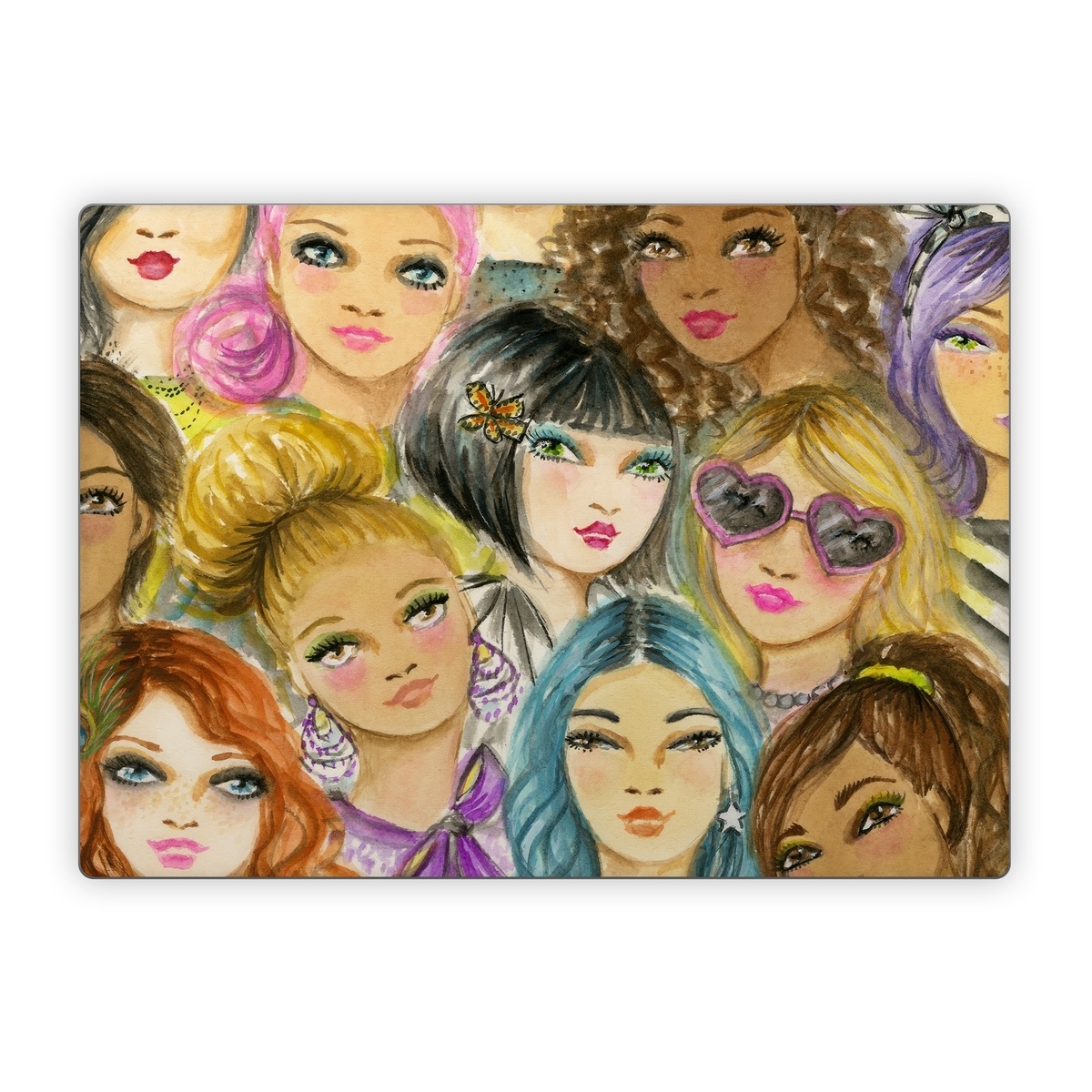 iStyles Microsoft Surface Laptop Series Skin design of Face, Hair, Head, Art, Hair coloring, Cheek, Illustration, Human, Watercolor paint, Brown hair, with white, black, brown, yellow, purple, blue, pink colors, and tagged with people, fineart, flowers, drawn, face, faces, fashion, handdrawn, painting, portrait, woman, women, sunglasses, chinese, caucasian, black, eurasian, asian, european, african.