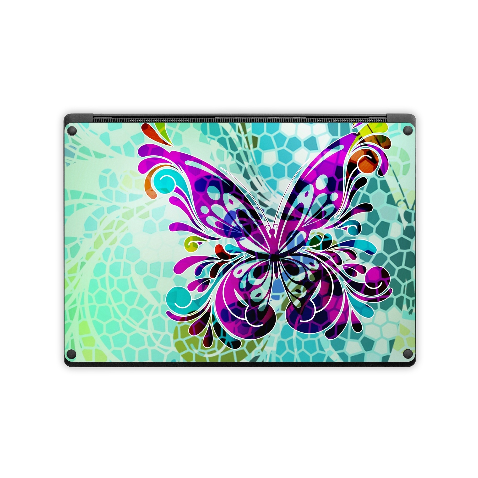 iStyles Microsoft Surface Laptop Series Skin design of Butterfly, Pattern, Insect, Moths and butterflies, Purple, Graphic design, Design, Pollinator, Visual arts, Magenta, with blue, green, purple colors, and tagged with patterns, animals.