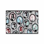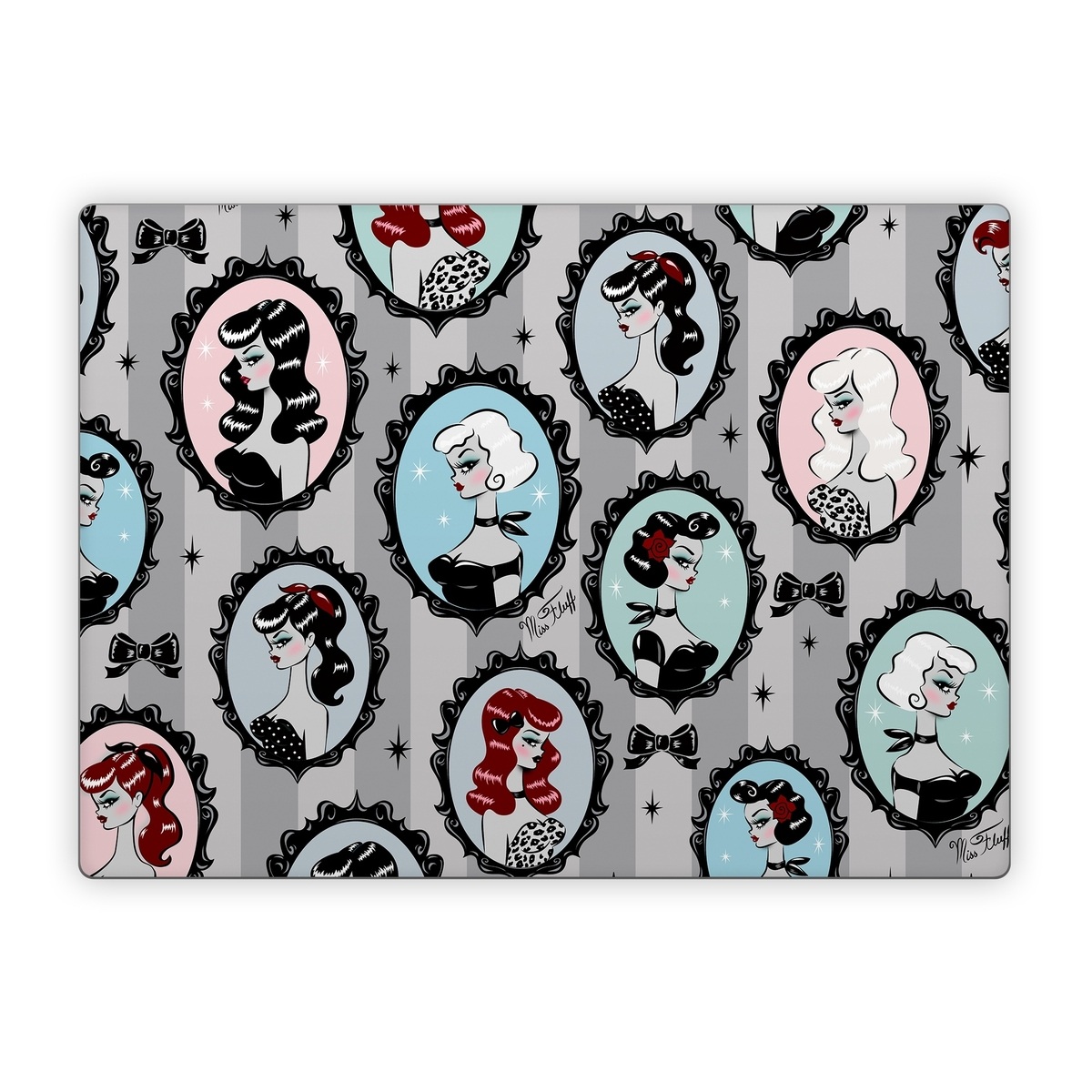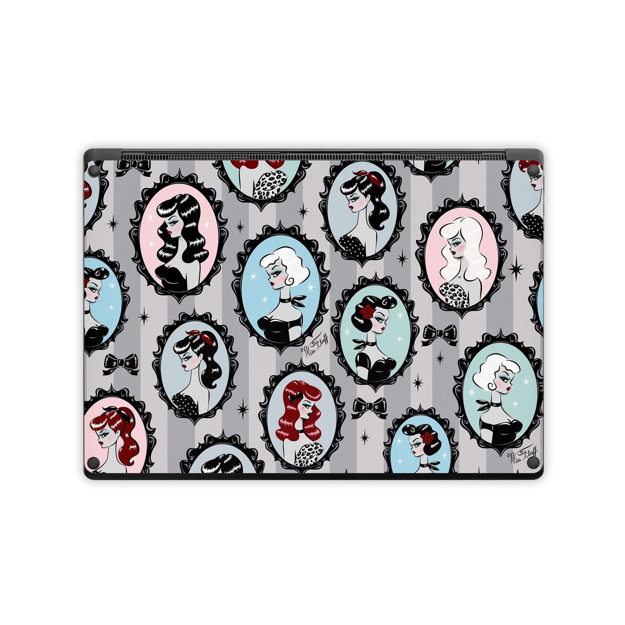 iStyles Microsoft Surface Laptop Series Skin design of Pattern, Design, Textile, Visual arts, Circle, Art, with black, blue, gray, yellow, red, pink colors, and tagged with patterns, people, objects, bows, cameo, dolls, pinup.