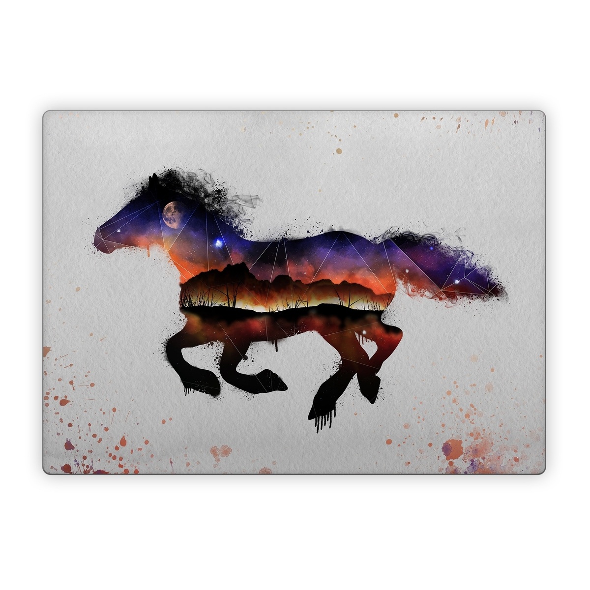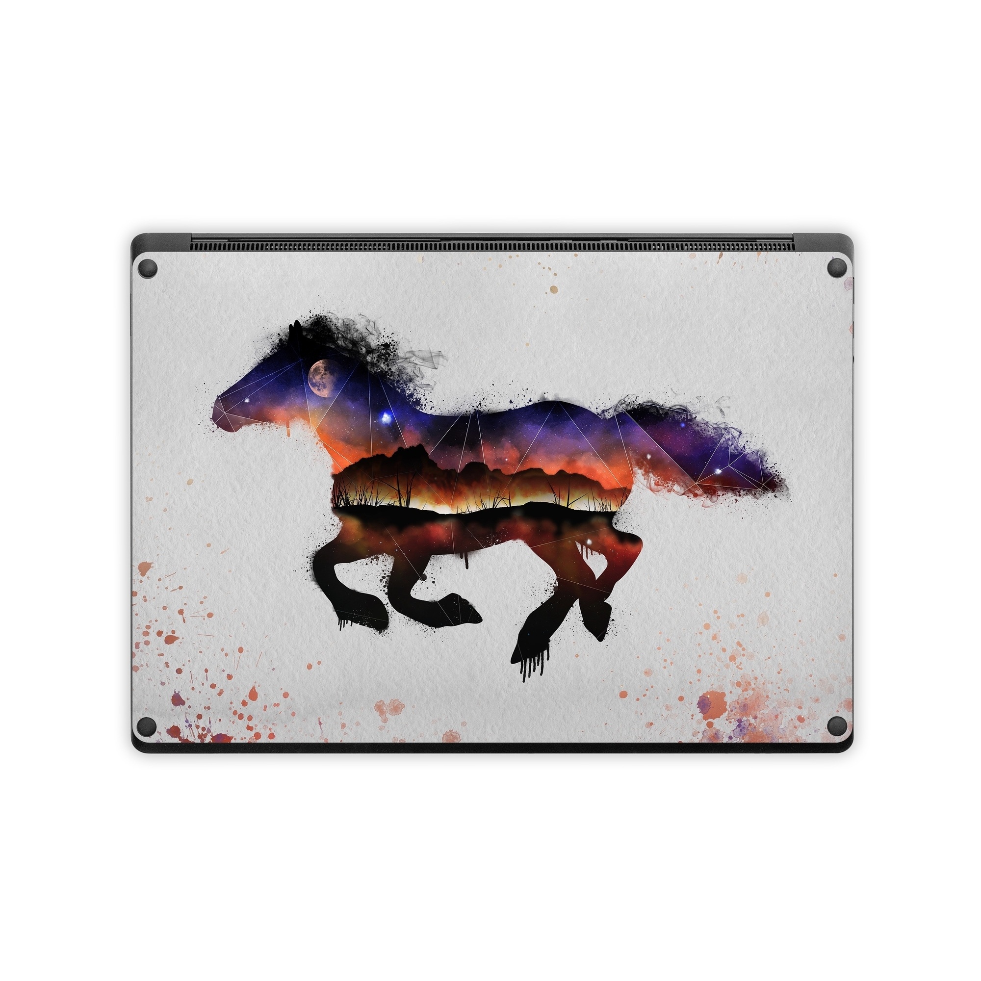 iStyles Microsoft Surface Laptop Series Skin design of Watercolor paint, Illustration, Art, Horse, Paint, Drawing, Graphic design, Painting, Visual arts, Mustang horse, with gray, white, purple, red, yellow, black, orange colors, and tagged with animals, nature, space, animals, horse, moon, nature, night, stars, watercolor.