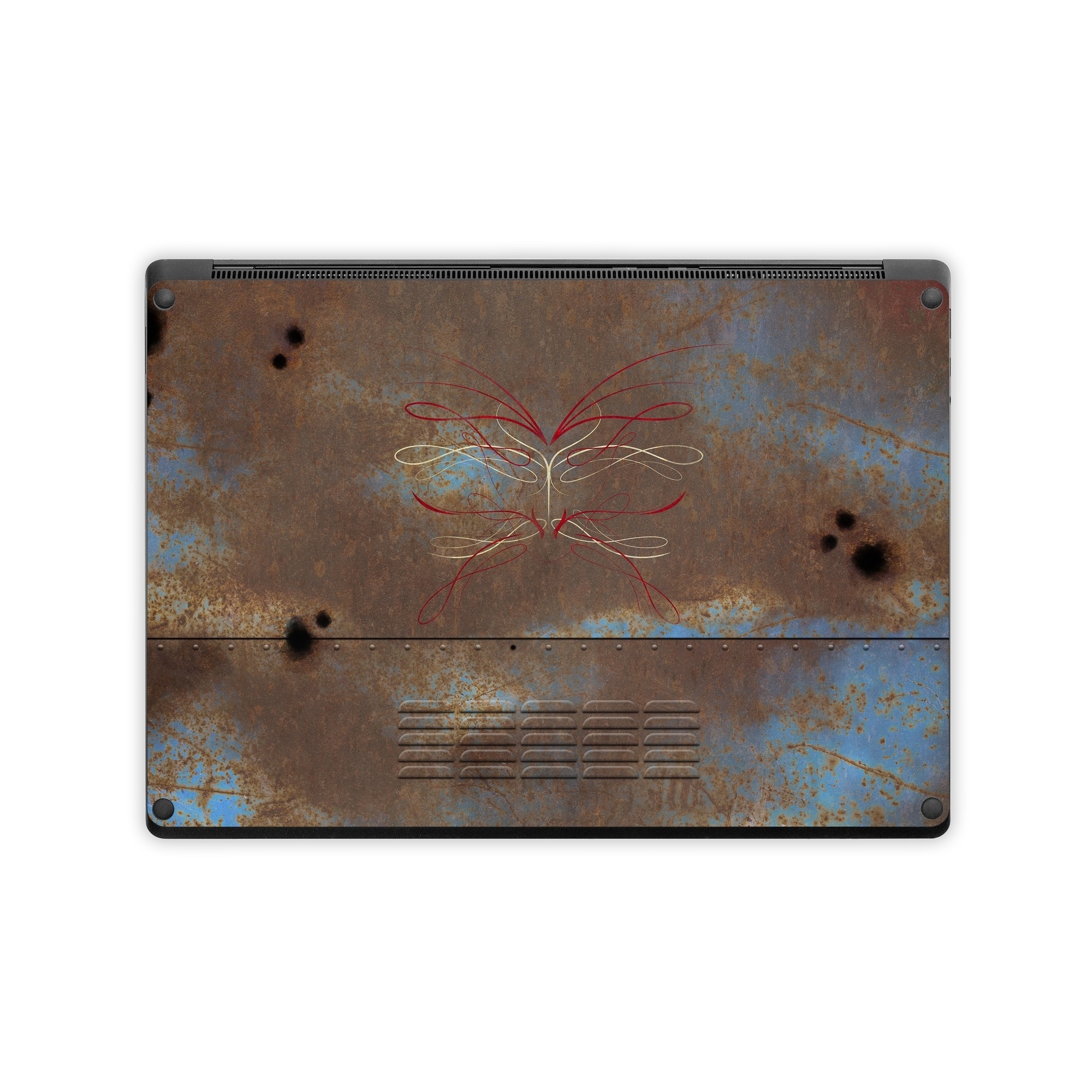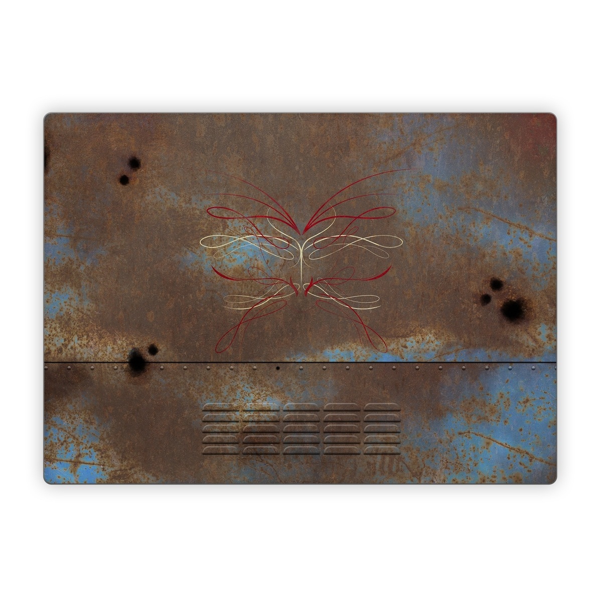 iStyles Microsoft Surface Laptop Series Skin design of Line, Visual arts, Symmetry, Concrete, Tints and shades, Painting, Art, with blue, red, yellow, brown, black colors, and tagged with signs, lookslike, objects, patterns, hotrod, musclecar, ratrod, retro, rust.