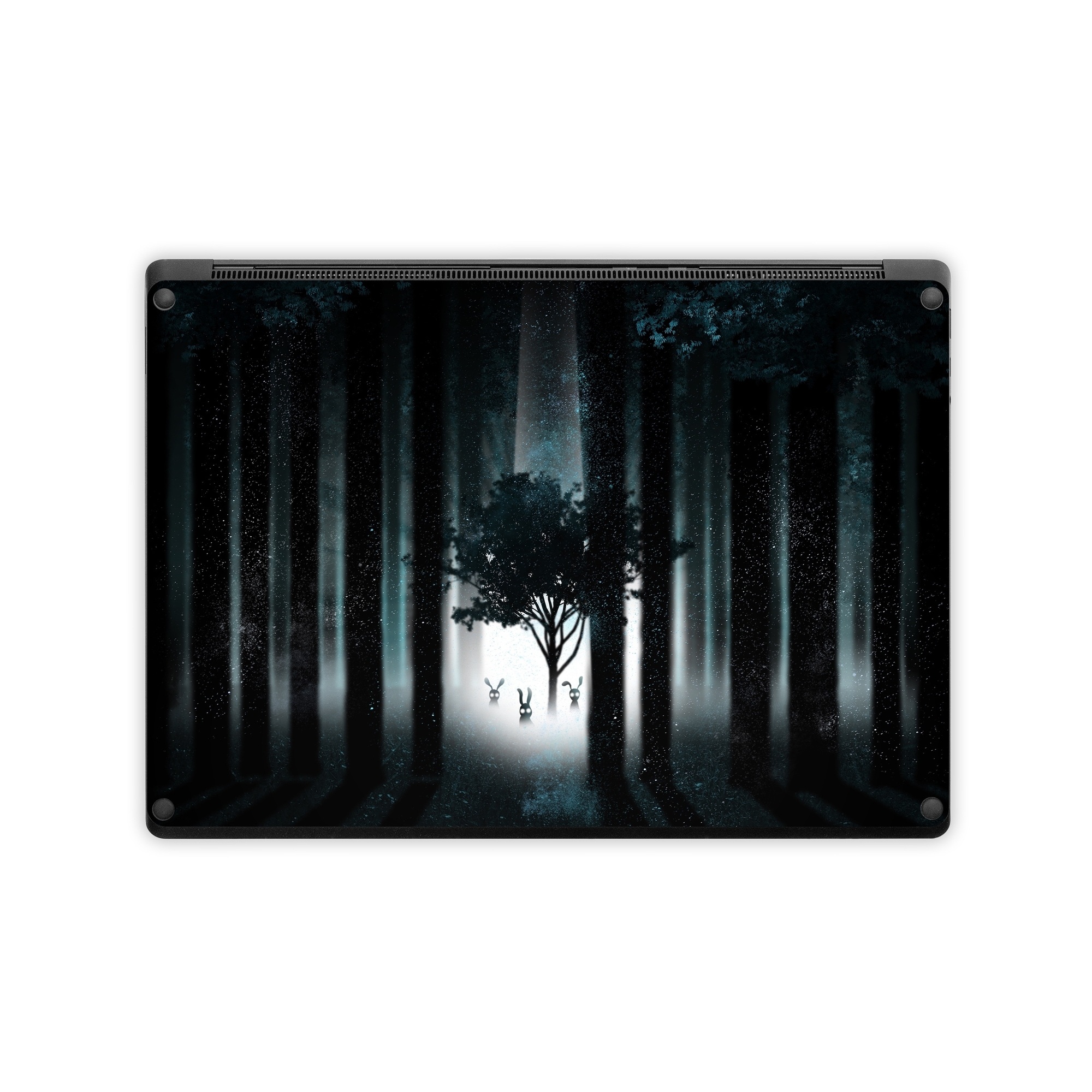 iStyles Microsoft Surface Laptop Series Skin design of Darkness, Black, Nature, Tree, Natural environment, Forest, Atmosphere, Atmospheric phenomenon, Light, Natural landscape, with black, blue, white colors, and tagged with animals, nature, fantasy, space, aliens, creatures, fae, fairy, forest, ghosts, lights, monsters, rabbit, scary, trees, ufo.