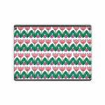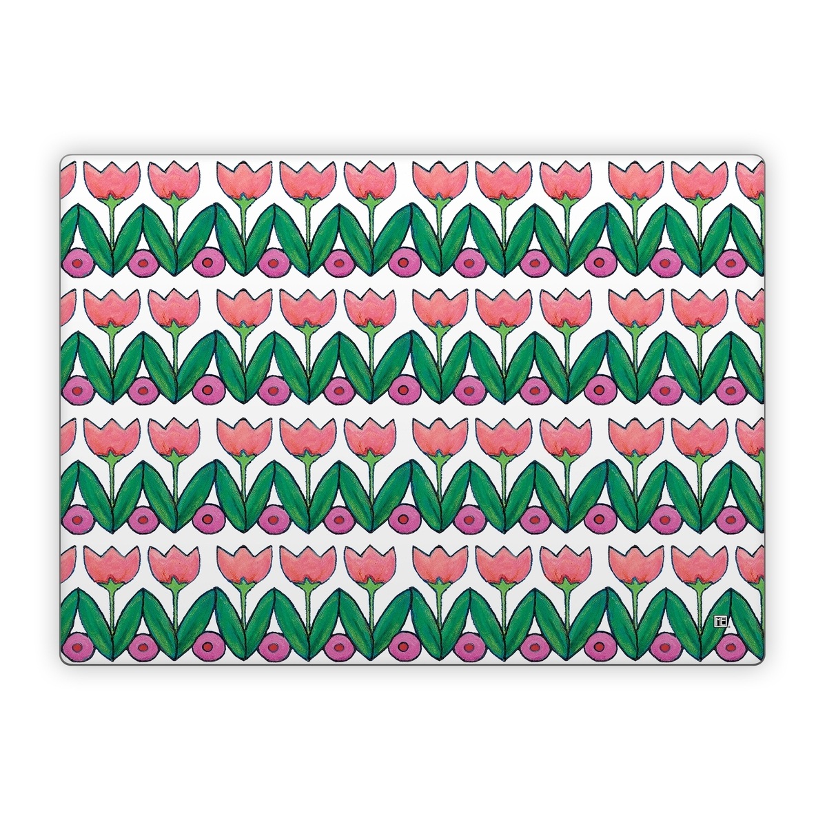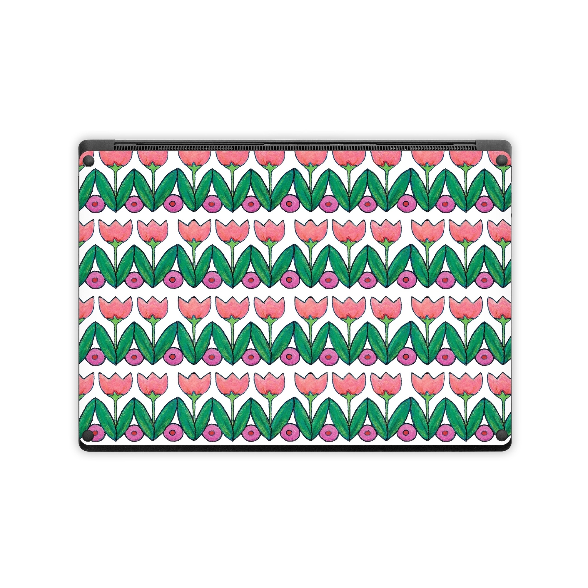 iStyles Microsoft Surface Laptop Series Skin design of Green, Rectangle, Textile, Botany, Line, Symmetry, Art, Font, Pattern, Magenta, with white, green, pink, purple colors, and tagged with patterns, flowers, tulip, drawing, repetative.