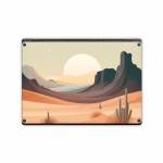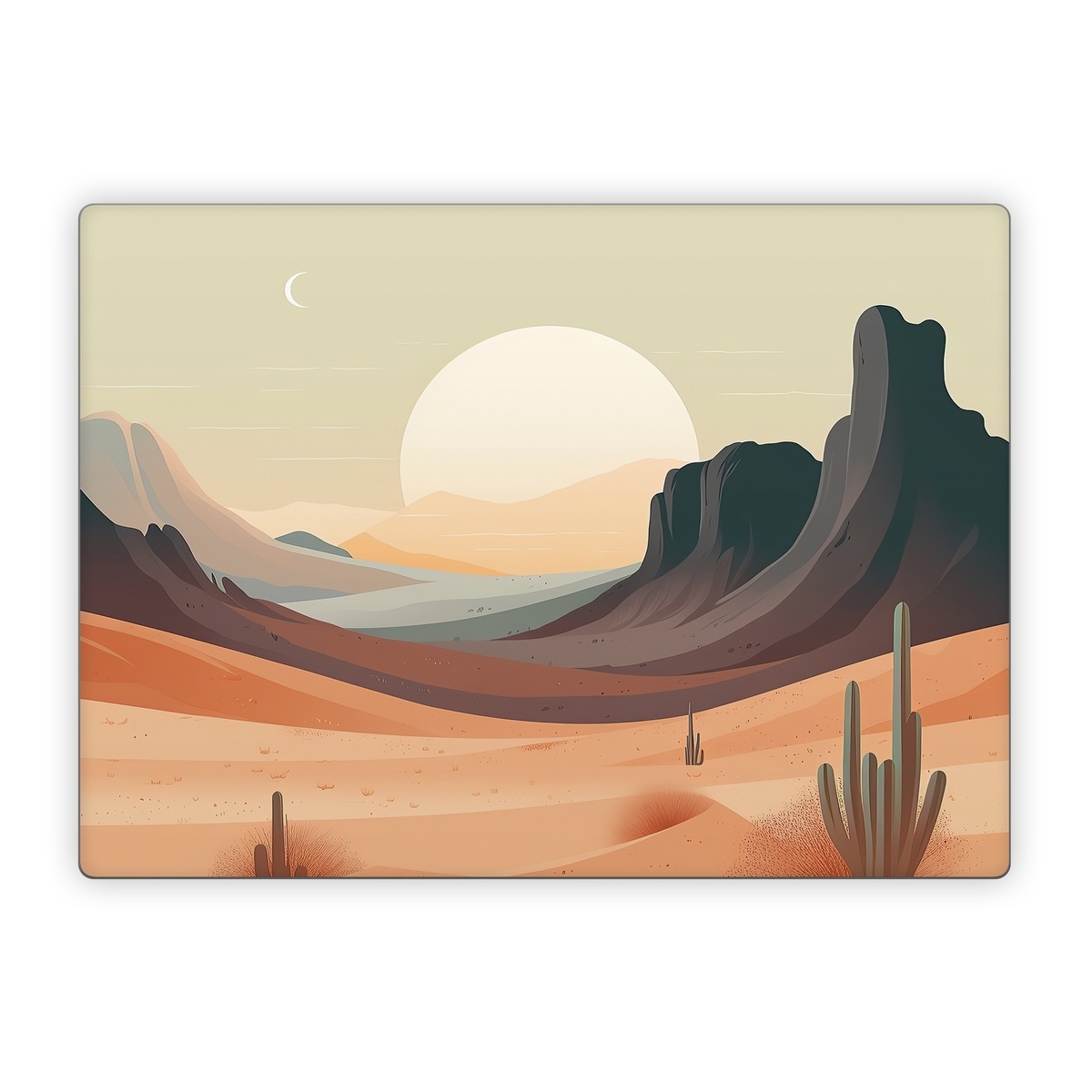 iStyles Microsoft Surface Laptop Series Skin design of Sky, Light, Nature, Natural landscape, Art, Landscape, Moon, Mountainous landforms, Formation, Erg, with orange, yellow, brown, green, white, black colors, and tagged with nature, desert, landscape, cactus, cliffs, sunset, moon, sand.
