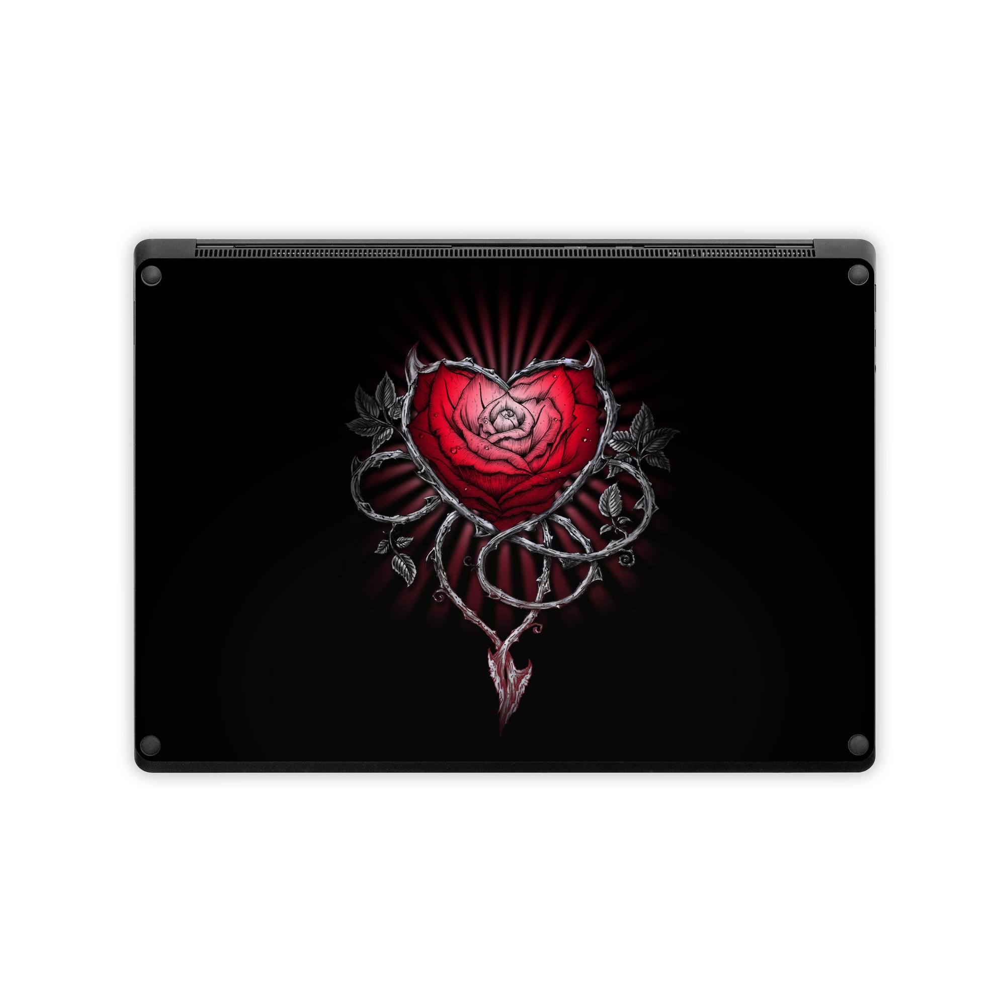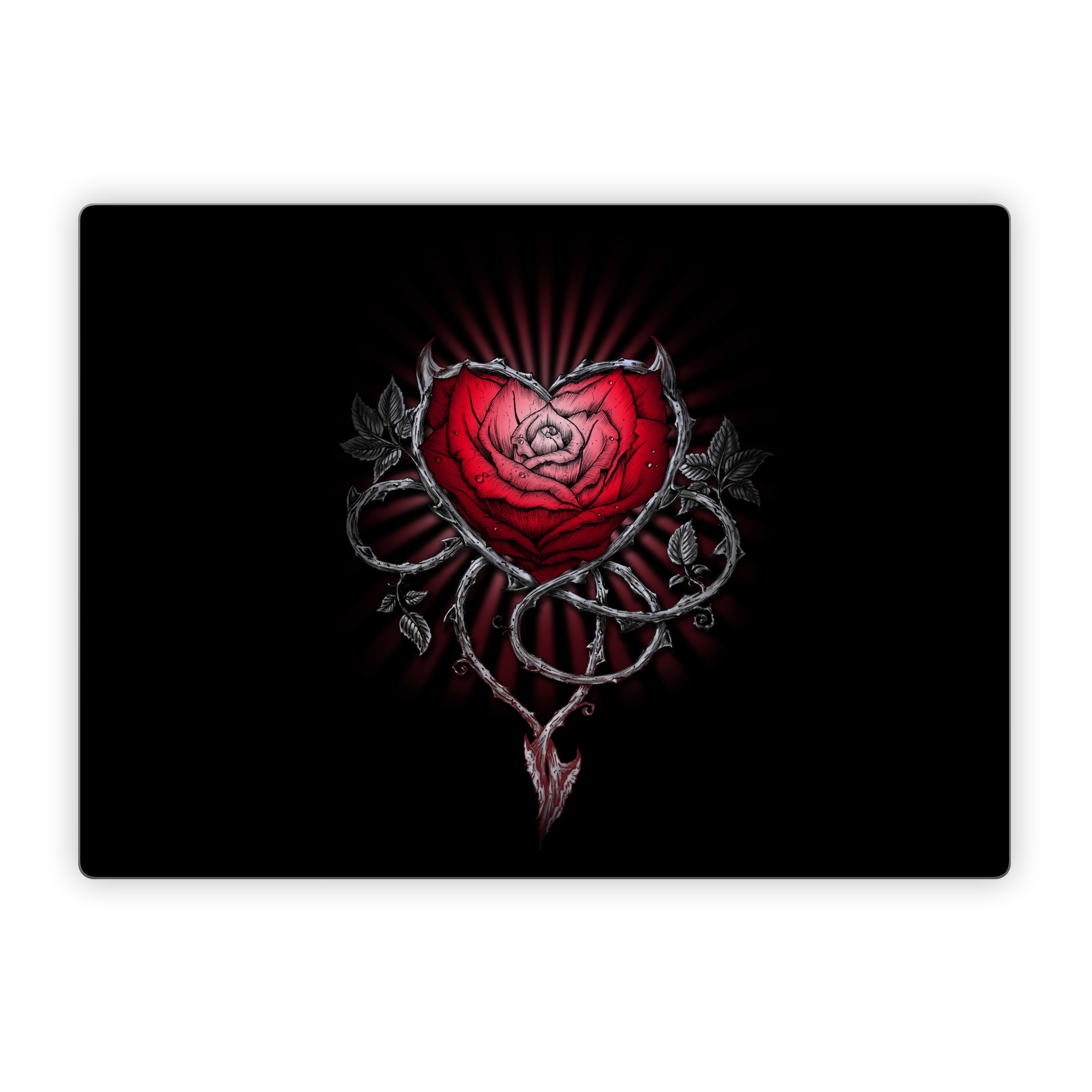 iStyles Microsoft Surface Laptop Series Skin design of Human body, Flash photography, Gesture, Sleeve, Petal, Font, Jewellery, Fictional character, Magenta, Symmetry, with black, white, red, gray colors, and tagged with signs, flowers, hearts, fantasy, vines, thorns, heart, rose.
