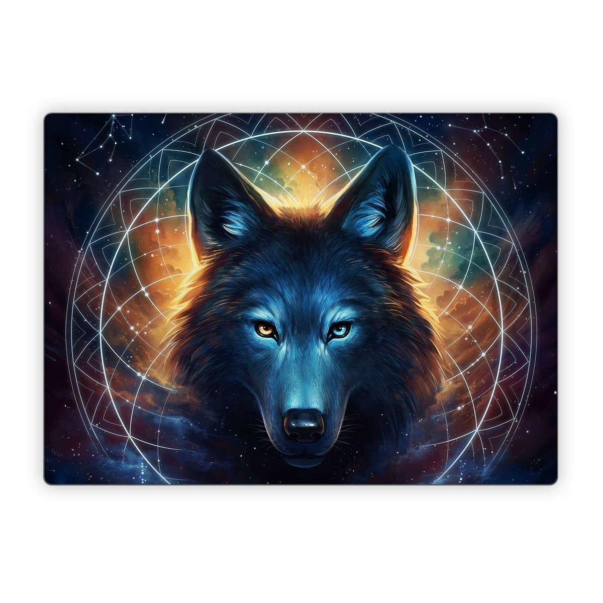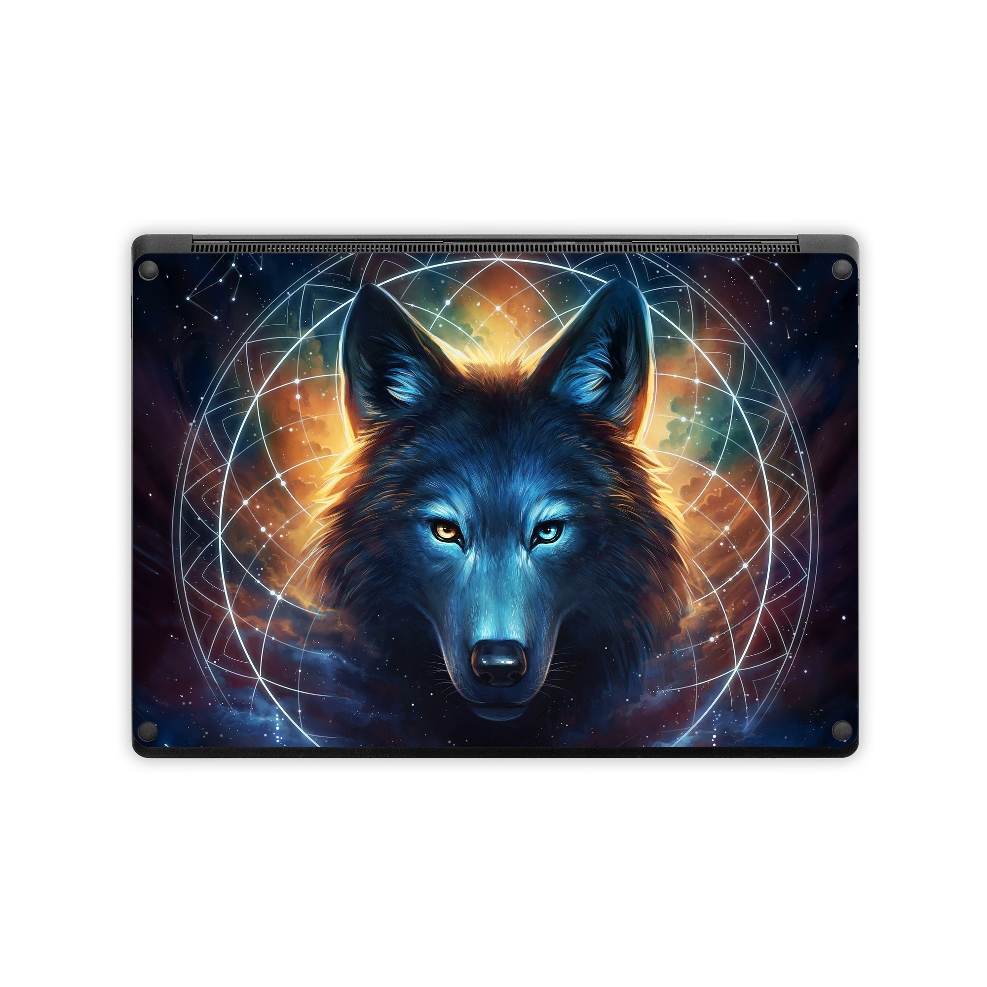 iStyles Microsoft Surface Laptop Series Skin design of Light, Nature, Carnivore, Organism, Dog breed, Art, Electric blue, Space, Midnight, Illustration, with black, blue, yellow, orange, green, red, white colors, and tagged with animals, signs, space, fantasy, blue, feathers, moon, sky, wolf, yellow.