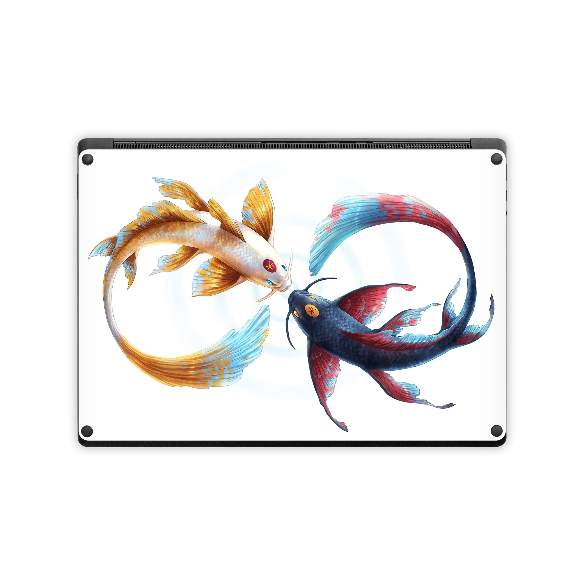 iStyles Microsoft Surface Laptop Series Skin design of Marine invertebrates, Art, Wing, Feather, Tree, Beak, Electric blue, Fish, Natural material, Painting, with white, black, yellow, orange, red, blue colors, and tagged with animals, signs, blue, fish, koi, red, yellow.