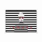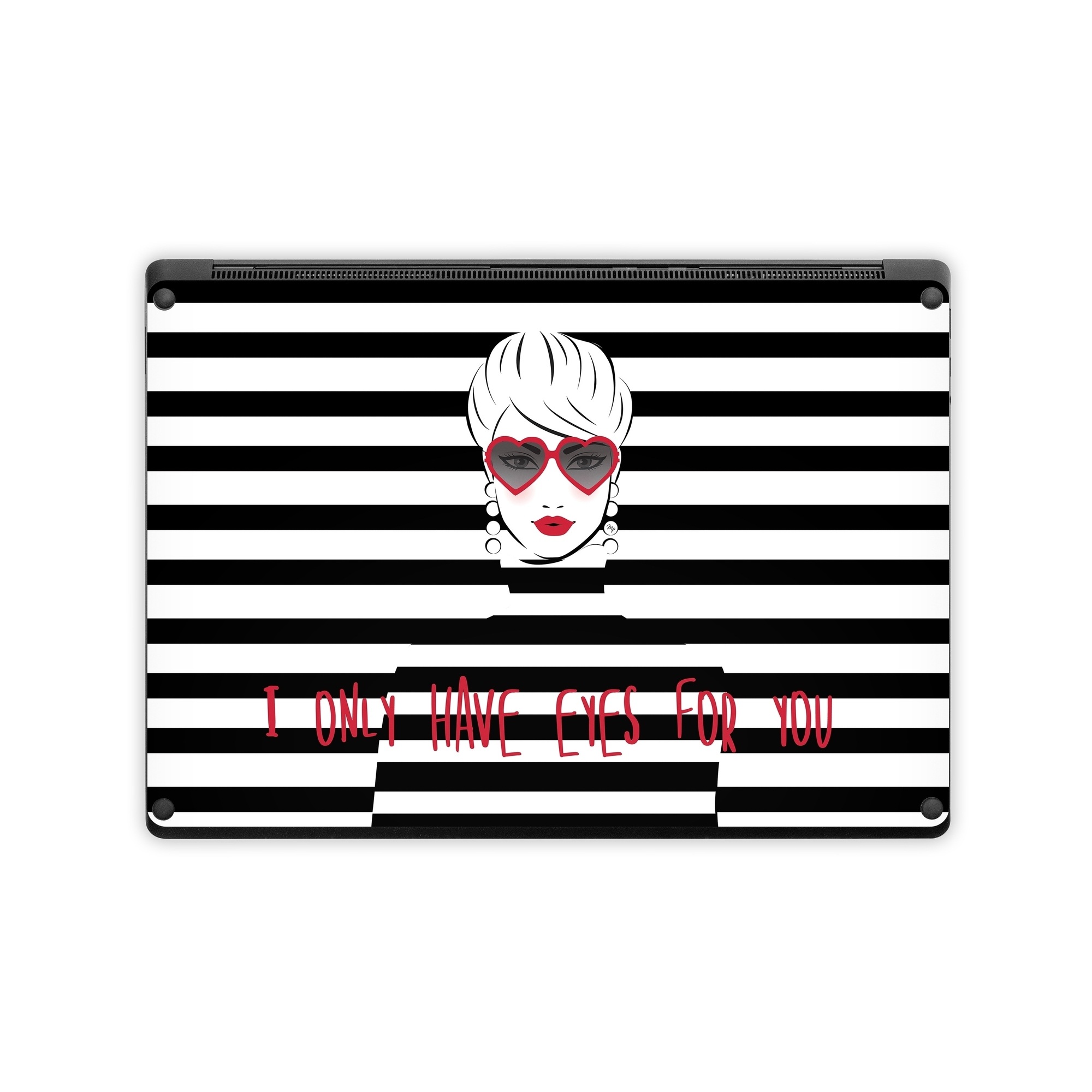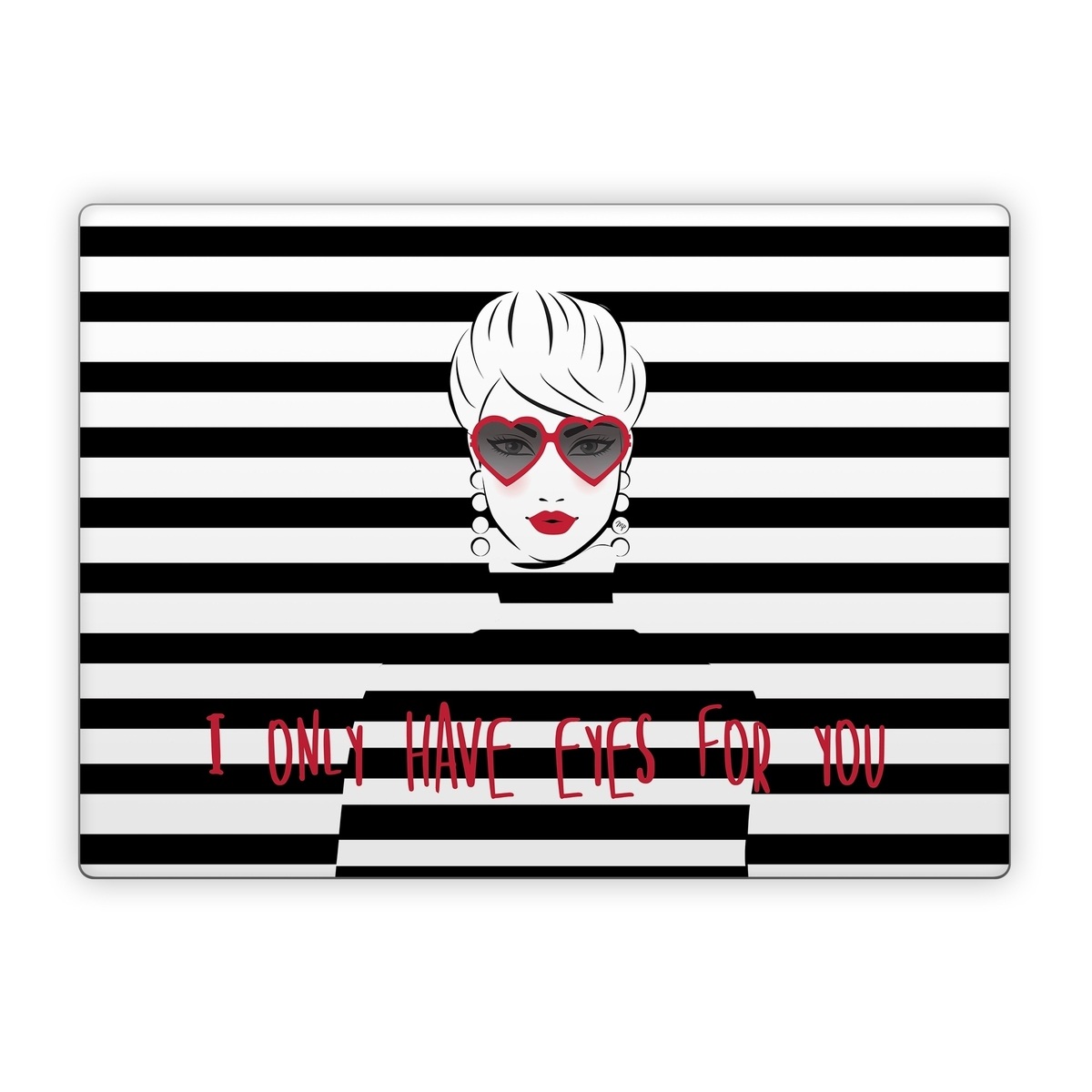 iStyles Microsoft Surface Laptop Series Skin design of Rectangle, Font, Gesture, Eyewear, Art, Technology, Personal protective equipment, Goggles, Logo, Eyelash, with black, white, yellow, red colors, and tagged with signs, objects, people, patterns, blackandwhite, girl, glasses, red, stripes, only, have, eyes, for, you.