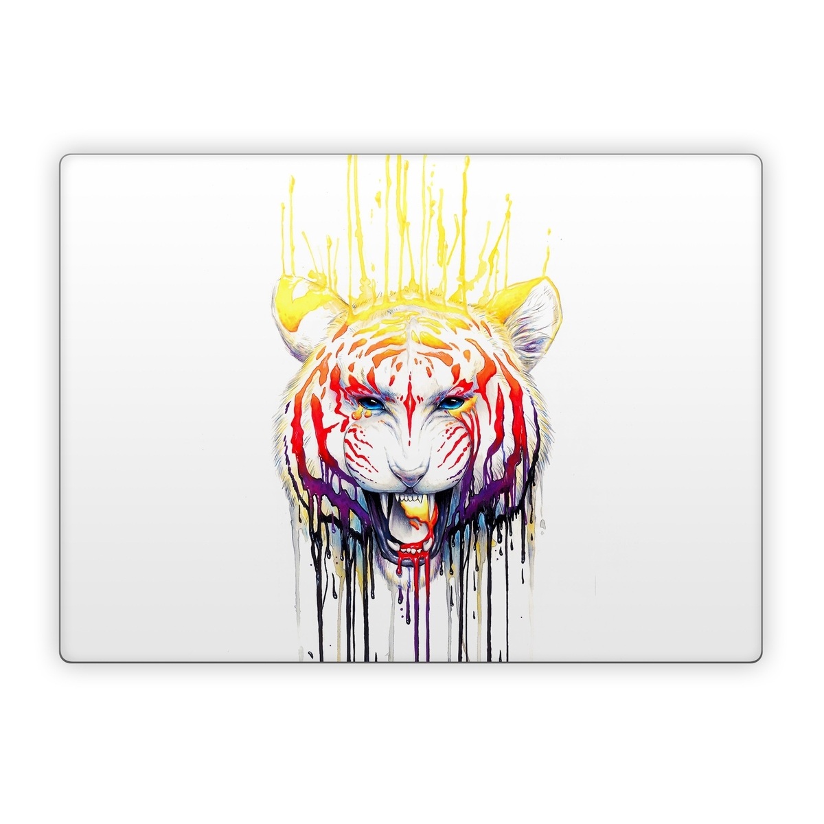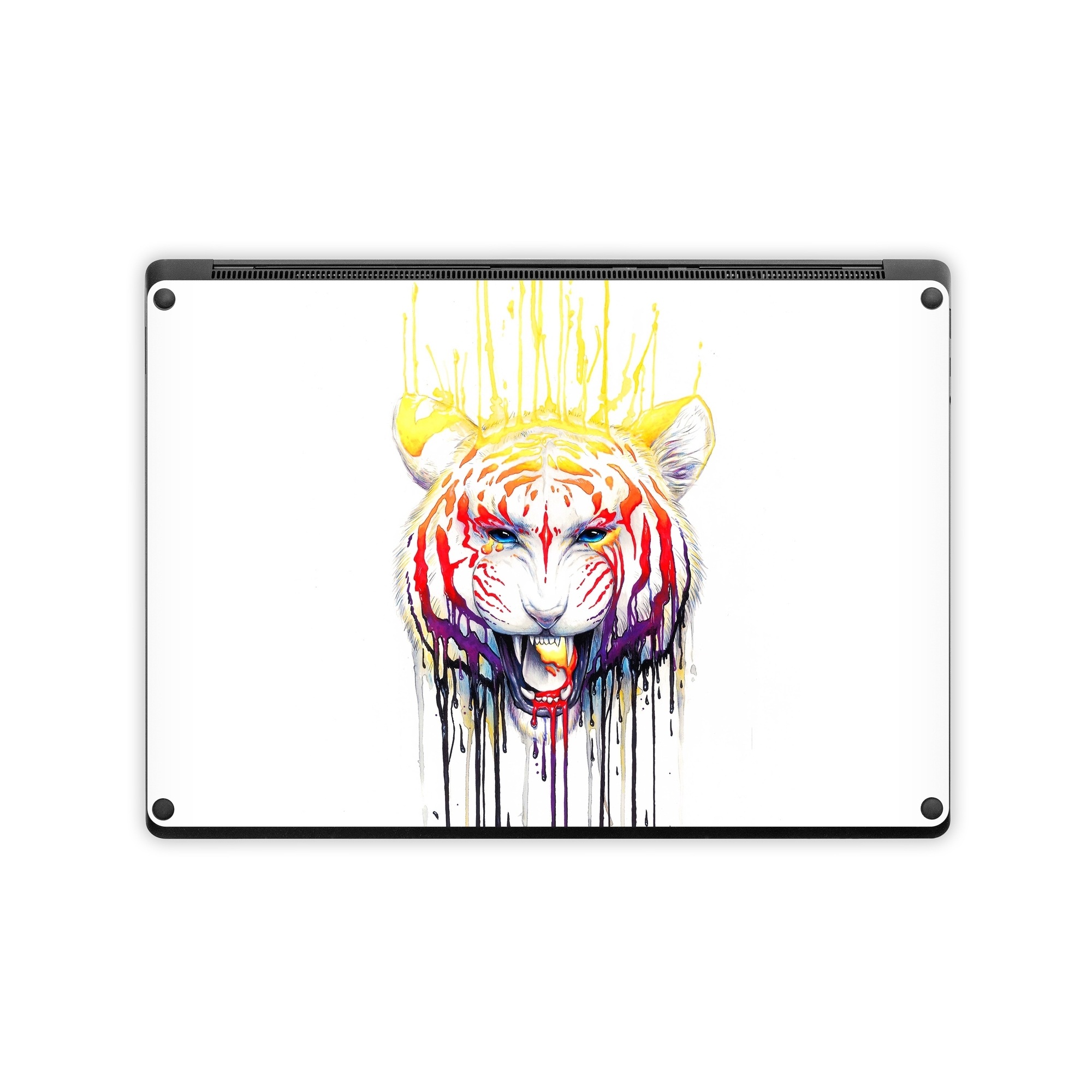 iStyles Microsoft Surface Laptop Series Skin design of Jaw, Roar, Organism, Gesture, Art, Font, Felidae, Painting, Illustration, Drawing, with white, black, yellow, red, orange, purple colors, and tagged with animals, paint, rainbow, tiger.