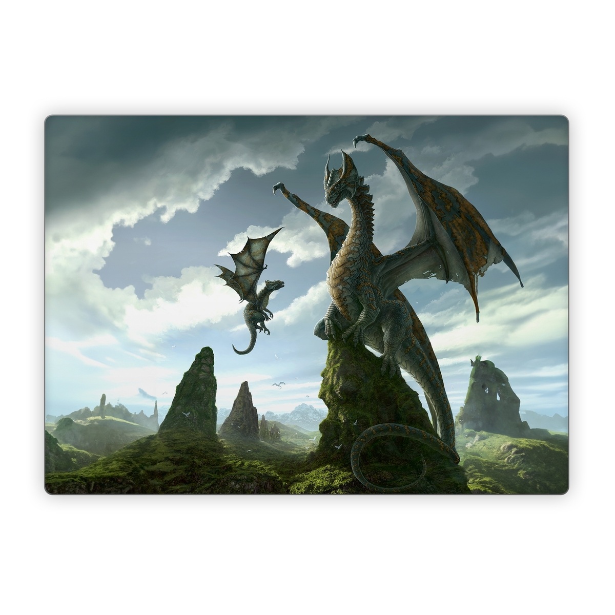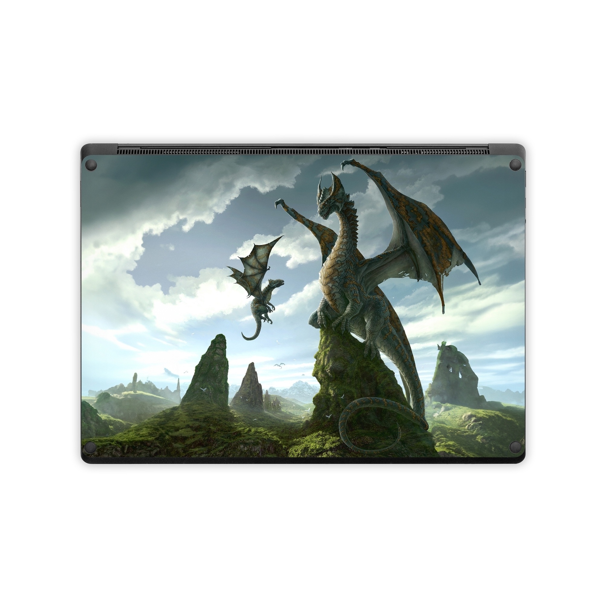 iStyles Microsoft Surface Laptop Series Skin design of Dragon, Cg artwork, Fictional character, Mythical creature, Mythology, Extinction, Cryptid, Illustration, Games, Massively multiplayer online role-playing game, with black, gray, blue, white, purple colors, and tagged with fantasy.
