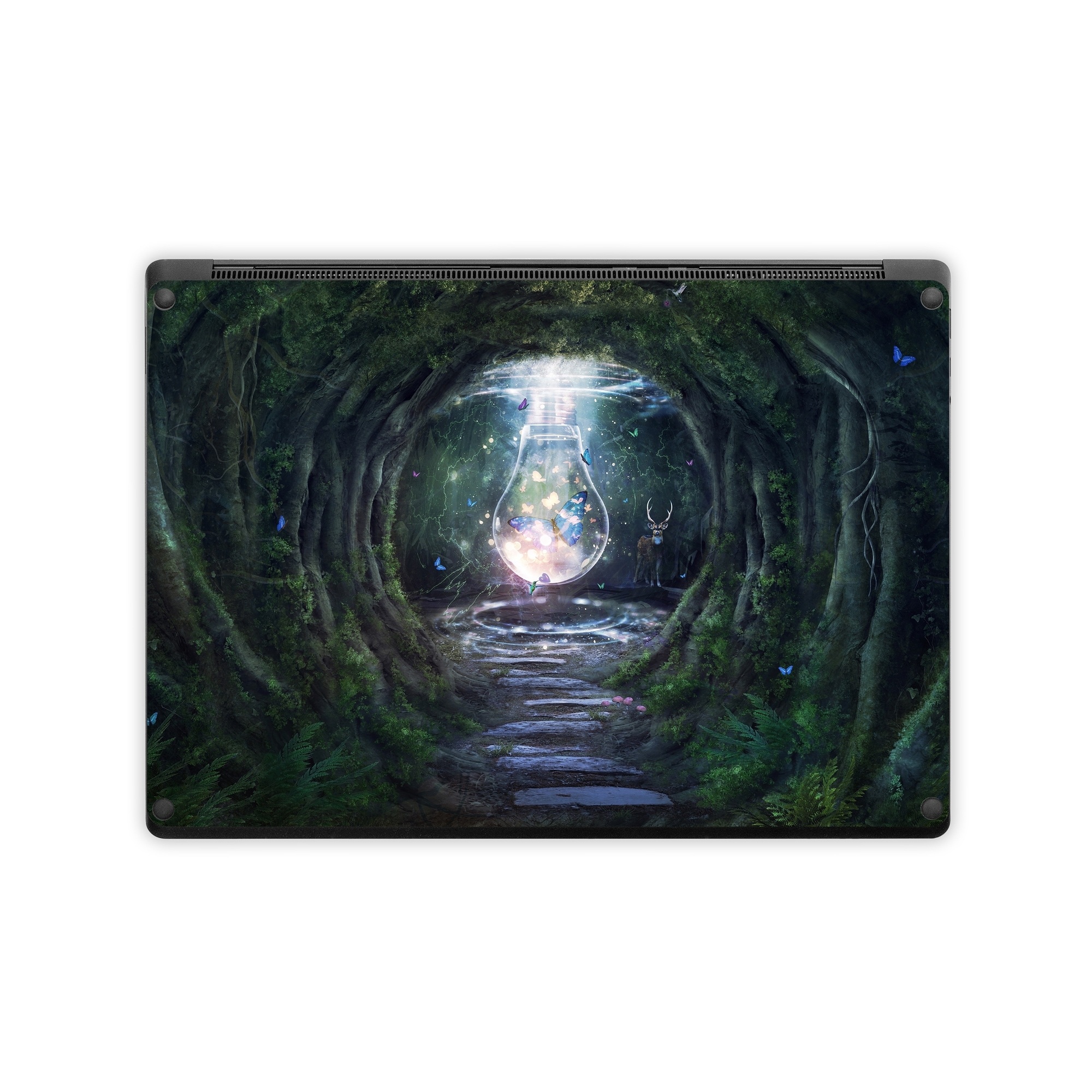 iStyles Microsoft Surface Laptop Series Skin design of Nature, Green, Darkness, Natural environment, Light, Infrastructure, Tunnel, Tree, Forest, Art, with white, black, brown, green, blue, yellow colors, and tagged with fantasy, animals, nature, animals, butterfly, deer, fantasy, forest, sci-fi, woods.