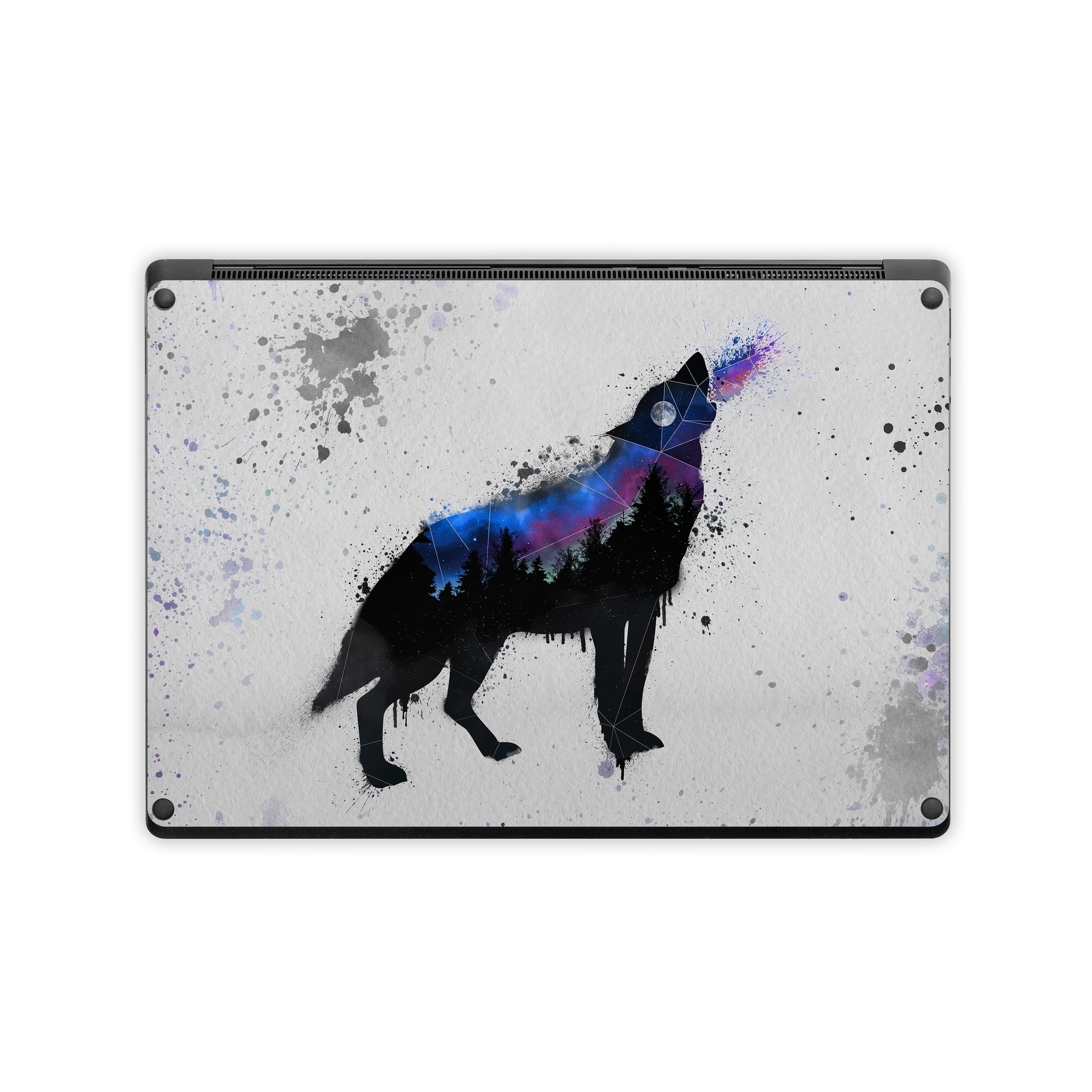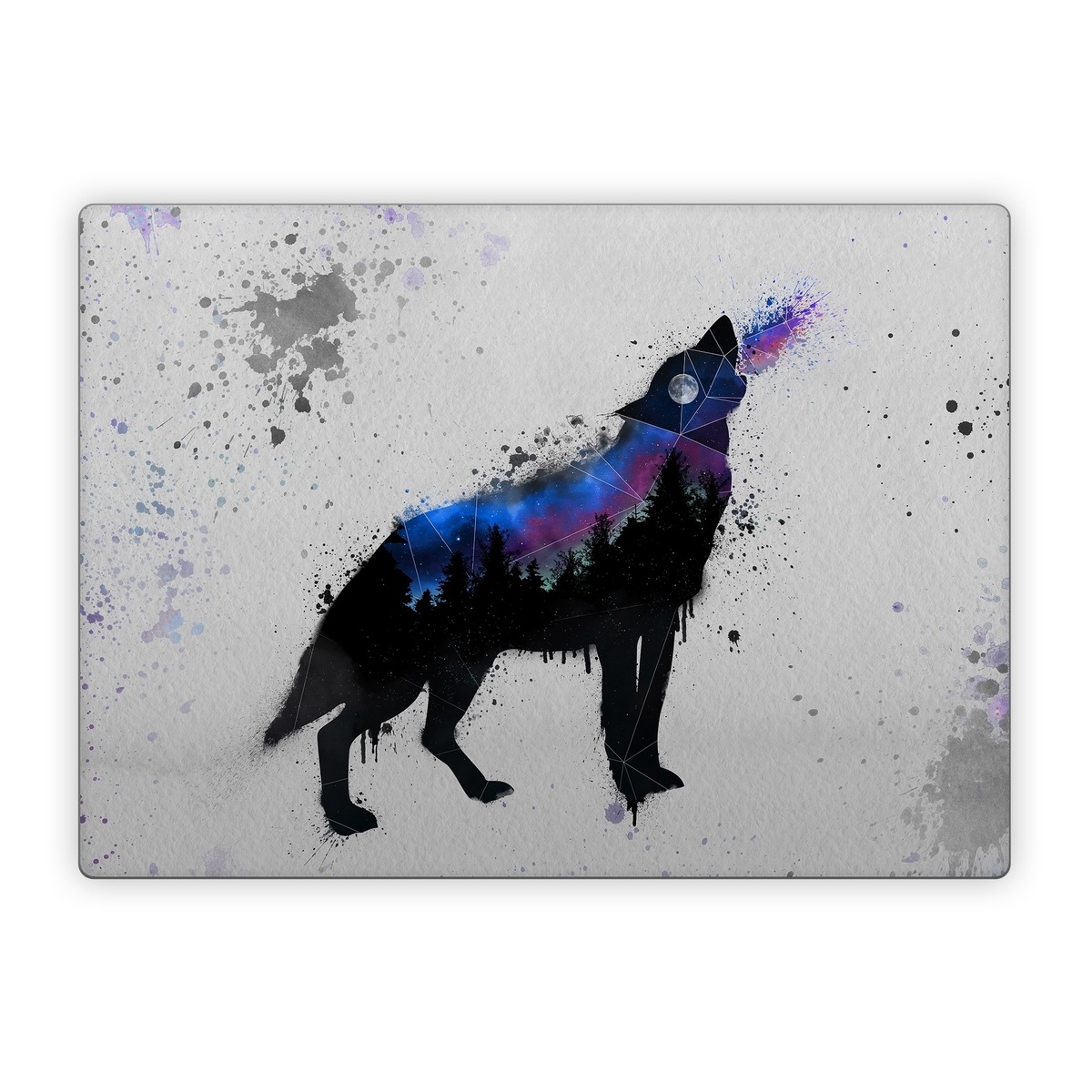 iStyles Microsoft Surface Laptop Series Skin design of Canidae, Art, Illustration, Watercolor paint, Dog, Graphic design, Street art, Acrylic paint, Painting, Visual arts, with gray, white, blue, black, green, purple colors, and tagged with animals, nature, space, animals, coyote, dog, moon, nature, night, stars, watercolor, wolf.