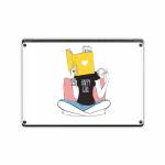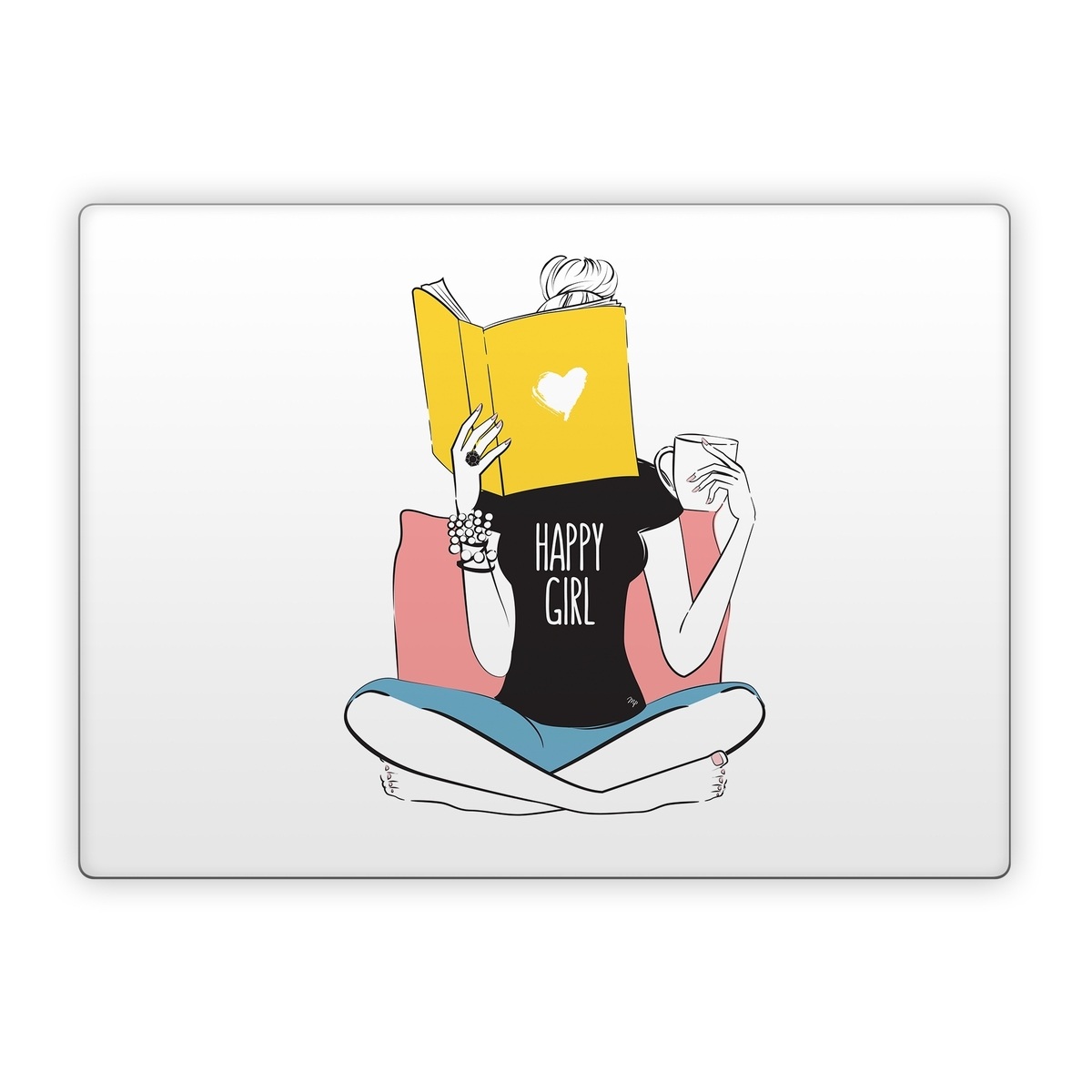 iStyles Microsoft Surface Laptop Series Skin design of White, Sleeve, Gesture, Cartoon, Comfort, Elbow, Font, Graphics, Knee, Art, with white, black, blue, pink, yellow colors, and tagged with objects, people, signs, hearts, reading, happy, cup, coffee, girl.