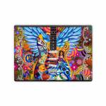 iStyles Microsoft Surface Laptop Series Skin design of Musical instrument, Guitar, Guitar accessory, Textile, Organism, String instrument, Plucked string instruments, String instrument accessory, Art, Font, with red, yellow, orange, pink, black, white, blue, brown, green colors, and tagged with music, flowers, people, signs, animals, nature, objects, hearts, guitar, wings, butterfly, flowers.