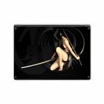 iStyles Microsoft Surface Laptop Series Skin design of Black, Photography, Leg, Black hair, Cg artwork, Darkness, Fetish model, Sitting, Flash photography, with black, yellow, gray, white colors, and tagged with fantasy, people, objects.