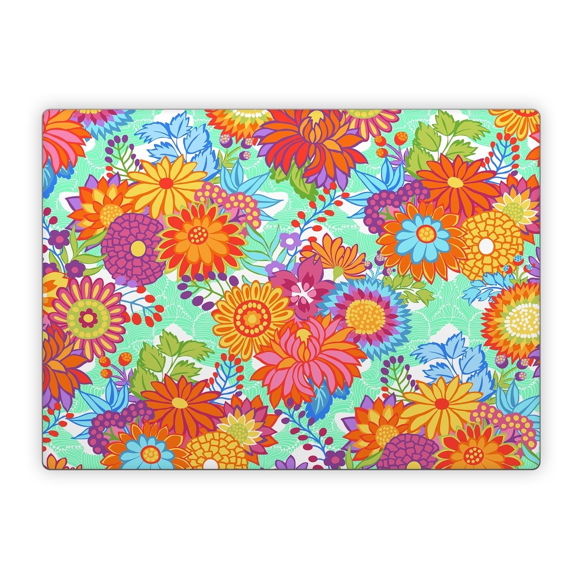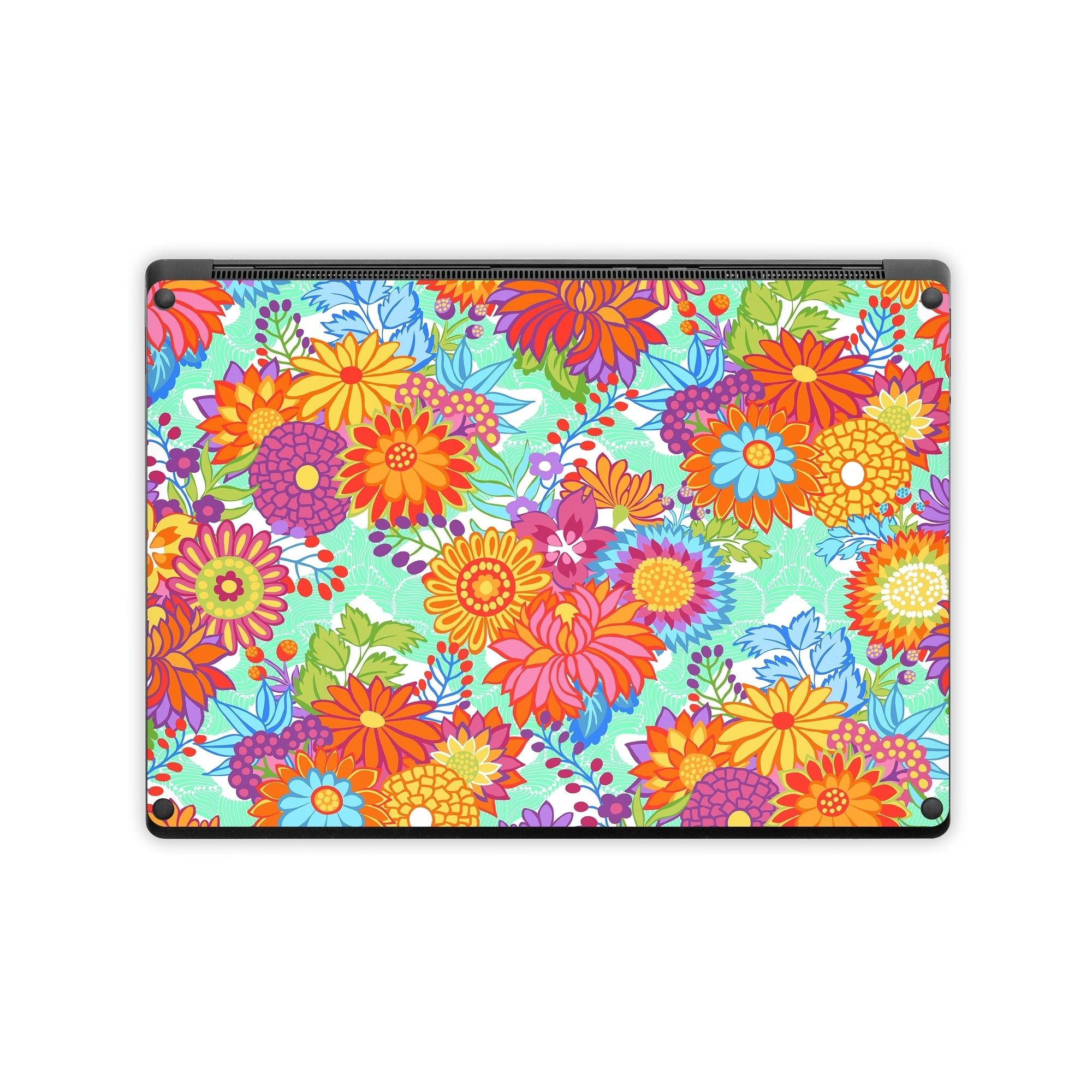 iStyles Microsoft Surface Laptop Series Skin design of Pattern, Floral design, Orange, Flower, Design, Textile, Plant, Wildflower, Wrapping paper, Visual arts, with gray, orange, green, purple colors, and tagged with patterns, flowers, bright, carnival, floral, flowers, fuchsia, green, orange, pattern, pink, yellow.