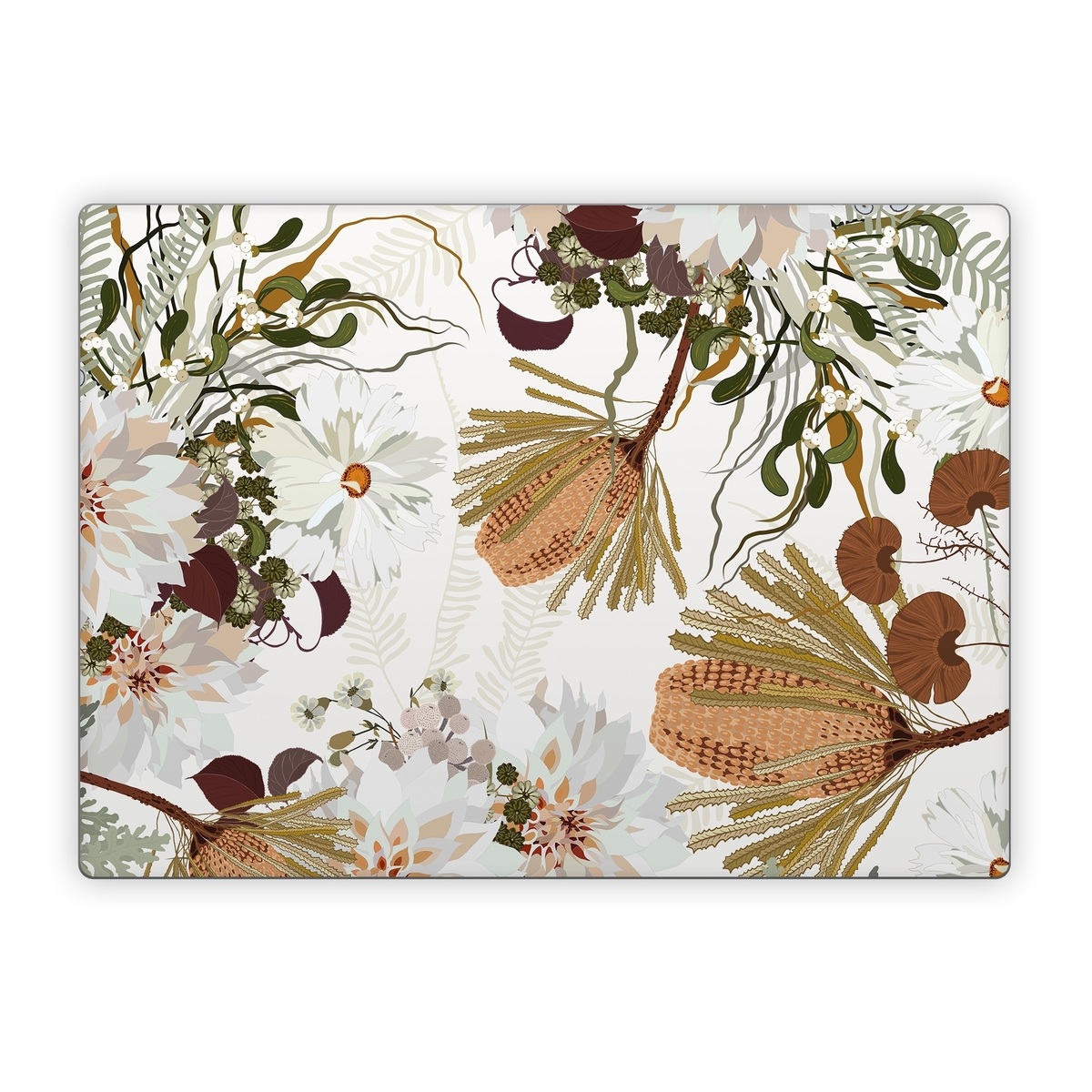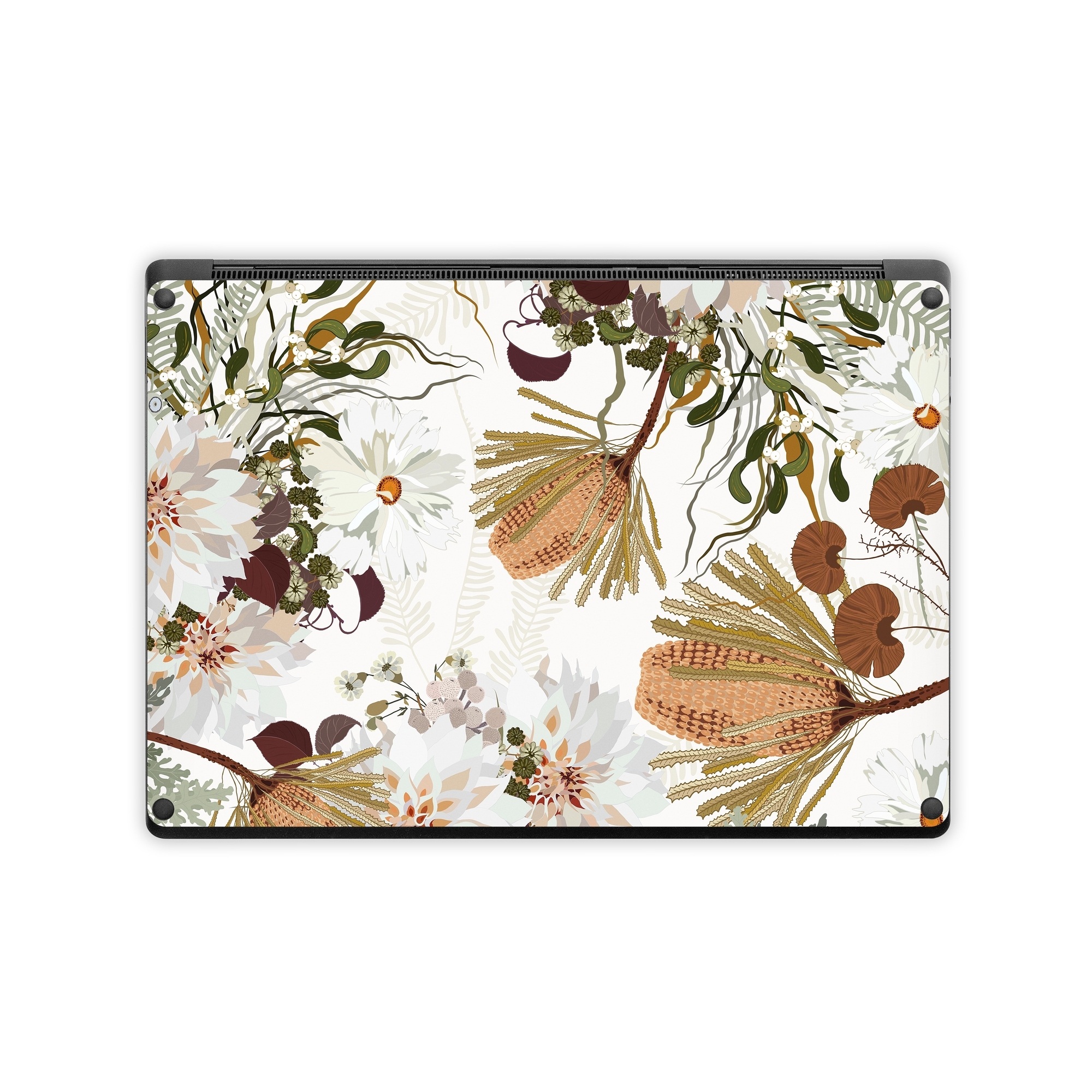 iStyles Microsoft Surface Laptop Series Skin design of Flower, Botany, Plant, Floral design, Wildflower, Pattern, Wallpaper, Textile, Petal, Butterfly, with white, brown, green, gray colors, and tagged with nature, patterns, flowers, brown, cream, filigree, floral, flower, flowers, green, leaf, leaves, nature, neutral, outdoor.
