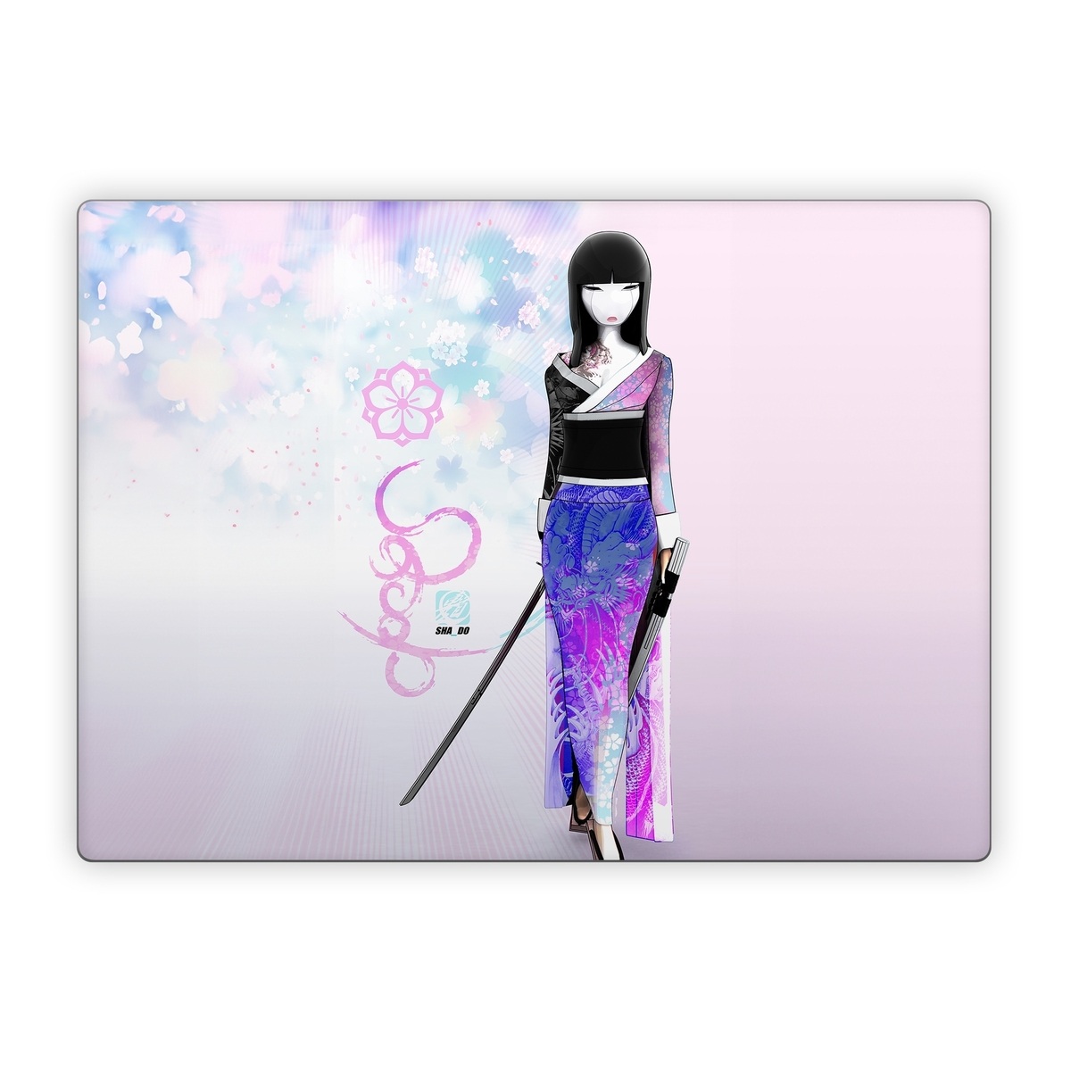 iStyles Microsoft Surface Laptop Series Skin design of Clothing, Fashion illustration, Fashion model, Pink, Fashion, Purple, Fashion design, Dress, Barbie, Illustration, with white, pink, purple, black, blue colors, and tagged with people, objects, flowers, signs, anime, shado, sword.